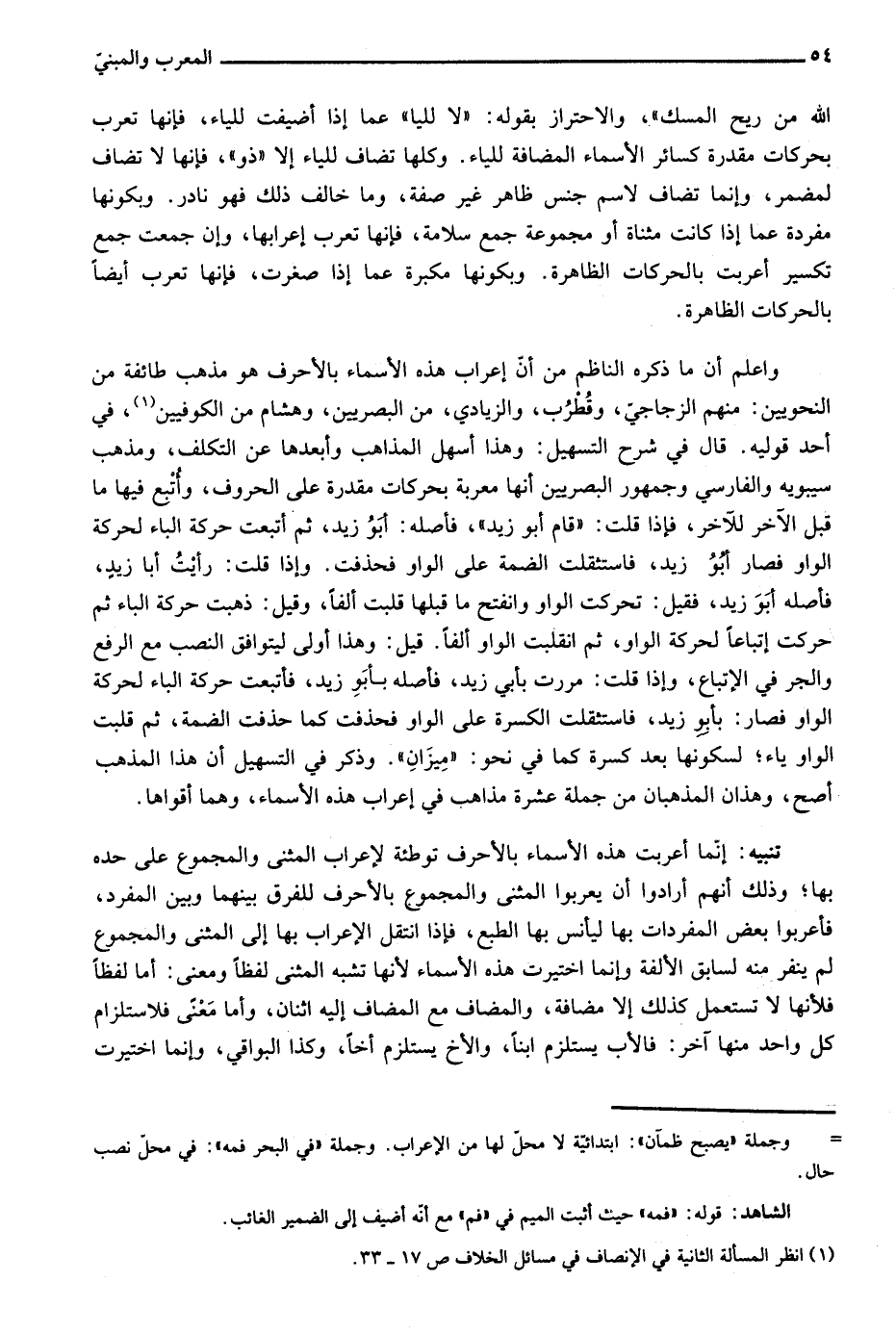 واعلم أن ما ذكره الناظم من أن إعراب هذه الأسماء بالأحرف هو مذهب طائفة من النحويين: منهم الزجاجي، وقطرب، والزيادي، من البصريين، وهشام من الكوفيين1، في أحد قوليه. قال في شرح التسهيل: وهذا أسهل المذاهب وأبعدها عن التكلف، ومذهب سيبويه والفارسي وجمهور البصريين أنها معربة بحركات مقدرة على الحروف وأتبع فيها ما قبل الآخر للآخر، فإذا قلت: "قام أبو زيد" فأصله: أبَوُ زيد، ثم أتبعت حركة الباء لحركة الواو فصار أبُوُ زيد، فاستثقلت الضمة على الواو فحذفت. وإذا قلت: رأيت أبا زيد، فأصله أبَوَ زيد، فقيل: تحركت الواو وانفتح ما قبلها قلبت ألفا، وقيل: ذهبت حركة الباء ثم حركت إتباعا لحركة الواو، ثم انقلبت الواو ألفا. قيل وهذا أولى ليتوافق النصب مع الرفع والجر في الإتباع، وإذا قلت: مررت بأبي زيد، فأصله بأبَو زيد، فأتبعت حركة الباء لحركة الواو فصار: بأبِو زيد، فاستثقلت الكسرة على الواو فحذفت كما حذفت الضمة، ثم قلبت الواو ياء؛ لسكونها بعد كسرة كما في نحو: "ميزان". وذكر في التسهيل أن هذا المذهب أصح، وهذان المذهبان من جملة عشرة مذاهب في إعراب هذه الأسماء، وهما أقواها.