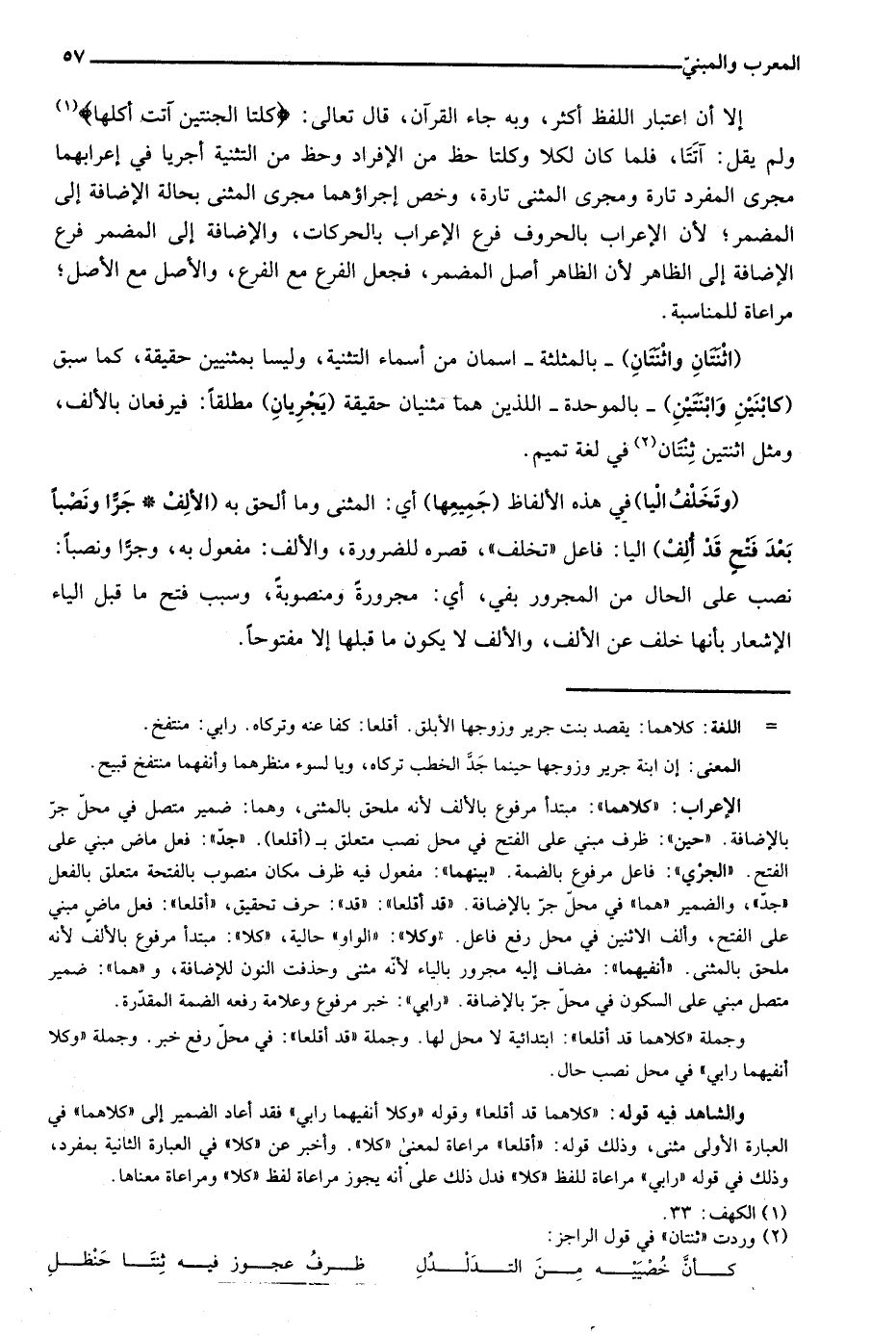 الإعراب: "كلاهما": مبتدأ مرفوع بالألف لأنه ملحق بالمثنى، وهما: ضمير متصل في محل جر بالإضافة. "حين": ظرف مبني على الفتح في محل نصب متعلق بـ"أقلعا". "جد": فعل ماض مبني على الفتح. "الجري" فاعل مرفوع بالضمة. "بينهما": مفعول فيه ظرف مكان منصوب بالفتحة متعلف بالفعل "جد"، والضمير "هما" في محل جر بالإضافة. "قد أقلعا": "قد": حرف تحقيق، "أقلعا": فعل ماض مبني على الفتح، وألف الاثنين في محل رفع فاعل. "وكلا": "الواو" حالية، "كلا": مبتدأ مرفوع بالألف لأنه ملحق بالمثنى. "أنفيهما": مضاف إليه مجرور بالياء لأنه مثنى وحذفت النون للإضافة، و"هما": ضمير متصل مبني على السكون في محل جر بالإضافة. "رابي": خبر مرفوع وعلامة رفعه الضمة المقدرة.