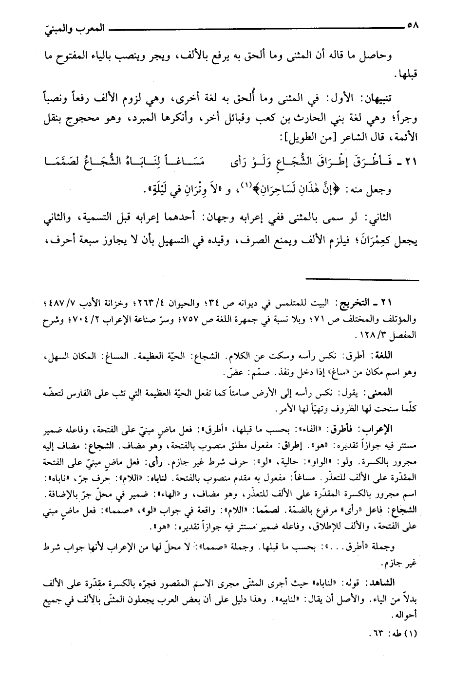 21- التخريج البيت للمتلمس في ديوانه ص34؛ والحيوان 4/ 263؛ وخزانة الأدب 7/ 487؛ والمؤتلف والمختلف ص71؛ وبلا نسبة في جمهرة اللغة ص757؛ وسر صناعة الإعراب 2/ 704؛ وشرح المفصل 3/ 128.
