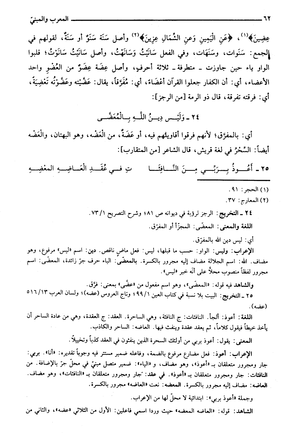 عِضِينَ} 1، {عَنِ الْيَمِينِ وَعَنِ الشِّمَالِ عِزِينَ} 2 وأصل سنة سنو أو سنة، لقولهم في الجمع: سنوات، وسنهات، وفي الفعل سانيت وسانهت، وأصل سانيت سانوت؛ قلبوا الواو ياء حين جاوزت -متطرفة- ثلاثة أحرف، وأصل عضة عضو من العضو واحد الأعضاء، أي: أن الكفار جعلوا القرآن أعضاء، أي: مفرقا، يقال: عضَّيته وعضوته تعضية، أي: فرقته تفرقة، قال ذو الرمة "من الرجز":
