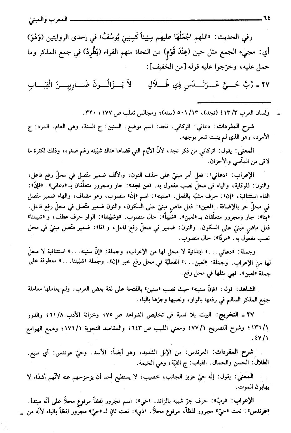الشاهد: قوله: "فإن سنينه" حيث نصب "سنين" بالفتحة على لغة بعض العرب. ولم يعاملها معاملة جمع المذكر السالم في رفعها بالواو، ونصبها وجرها بالياء.