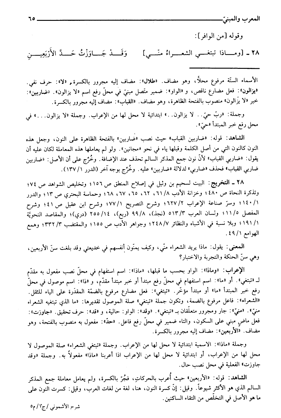 الشاهد: قوله: "الأربعين" حيث أعرب بالحركات، فجر بالكسرة، ولم يعامل جمع المذكر السالم الذي هو الأكثر شيوعا. وقيل: إن كسرة النون، هنا، لغة من لغات العرب، وقيل: كسرت النون على ما هو الأصل في التخلص من التقاء الساكنين.