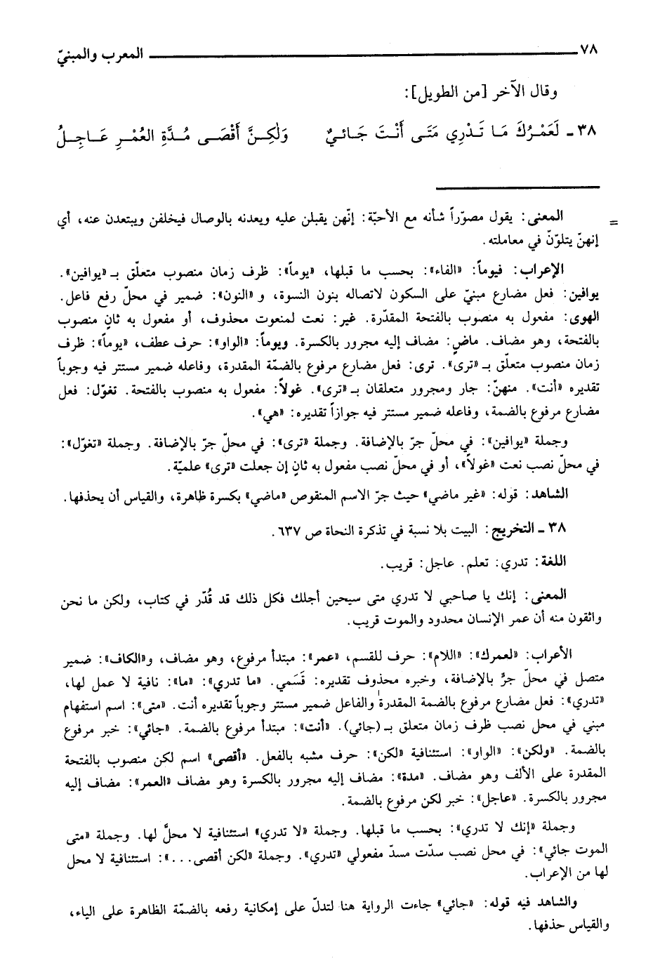 الإعراب: "لعمرك": "اللام": حرف للقسم، "عمر": مبتدأ مرفوع، وهو مضاف، و"الكاف": ضمير متصل في محل جر بالإضافة، وخبره محذوف تقديره: قسمي. "ما تدري": "ما": نافية لا عمل لها، "تدري": فعل مضارع مرفوع بالضمة المقدرة والفاعل ضمير مستتر وجوبا تقديره أنت. "متى": اسم استفهام مبني في محل نصب ظرف زمان متعلق بـ"جائي". "أنت": مبتدأ مرفوع بالضمة. "جائي": خبر مرفوع بالضمة. "ولكن": "الواو": استئنافية, "لكن": حرف مشبه بالفعل. "أقصى" اسم لكن منصوب بالفتحة المقدرة على الألف وهو مضاف. "مدة": مضاف إليه مجرور بالكسرة وهو مضاف "العمر": مضاف إليه مجرور بالكسرة. "عاجل": خبر لكن مرفوع بالضمة.