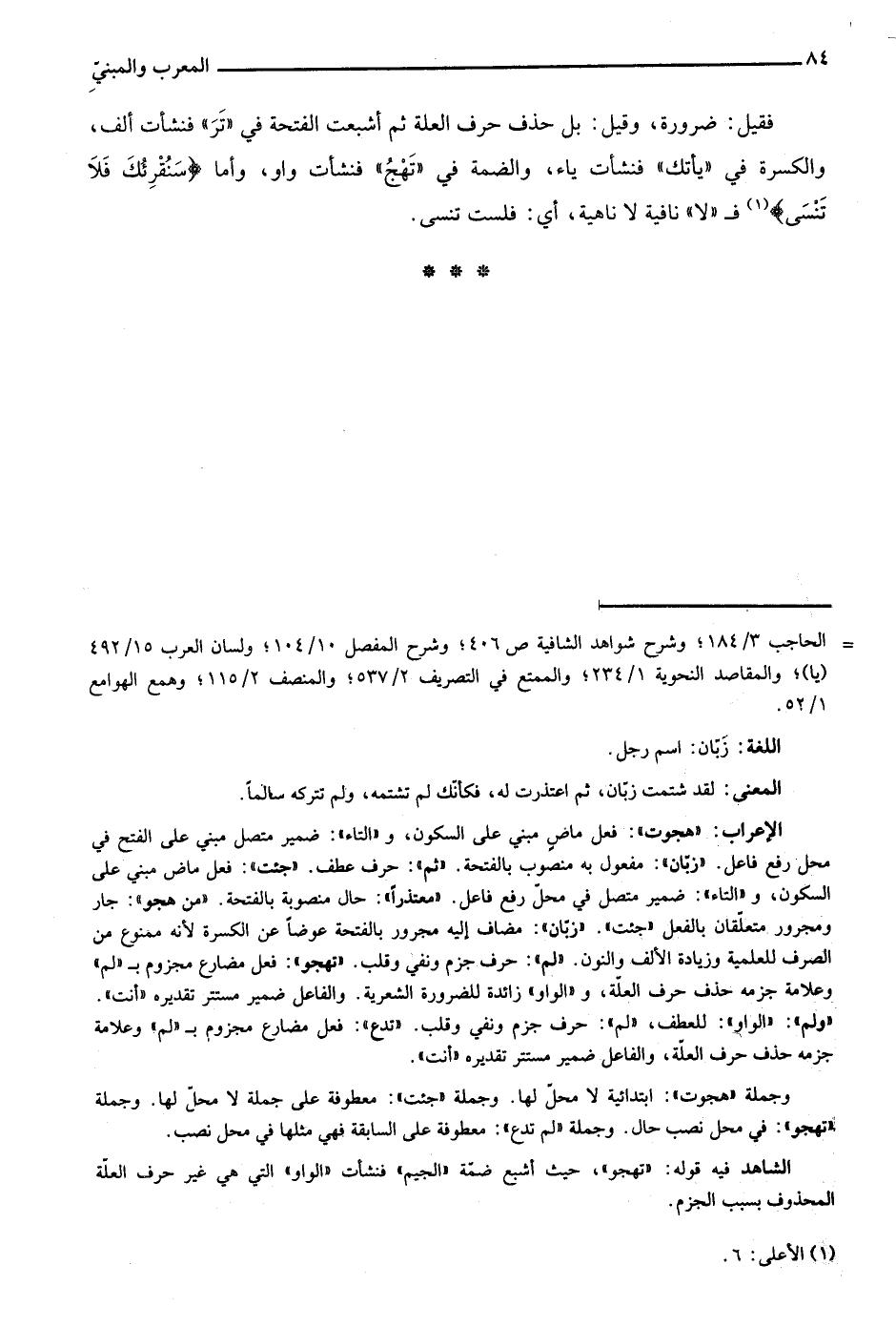 الإعراب: "هجوت": فعل ماض مبني على السكون، و"التاء": ضمير متصل مبني على الفتح في محل رفع فاعل. "زبان": مفعول به منصوب بالفتحة. "ثم": حرف عطف. "جئت": فعل ماض مبني على السكون، و"التاء": ضمير متصل في محل رفع فاعل. "معتذرا": حال منصوب بالفتحة. "من هجو": جار ومجرور متعلقان بالفعل "جئت". "زبان": مضاف إليه مجرور بالفتحة عوضا عن الكسرة لأنه ممنوع من الصرف للعلمية وزيادة الألف والنون. "لم": حرف جزم ونفي وقلب. "تهجو": فعل مضارع مجزوم بـ"لم" وعلامة جزمه حذف حرف العلة، و"الواو" زائدة للضرورة الشعرية. والفاعل ضمير مستتر تقديره "أنت". "ولم": "الواو": للعطف، "لم": حرف جزم ونفي وقلب. "تدع": فعل مضارع مجزوم بـ"لم" وعلامة جزمه حذف حرف العلة، والفاعل ضمير مستتر تقديره "أنت".