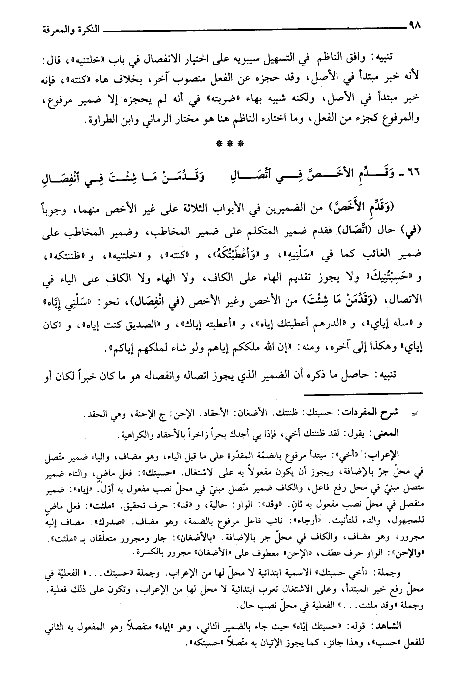 "وَقَدِّم الأَخَصَّ" من الضميرين في الأبواب الثلاثة على غير الأخص منهما، وجوبا "فِي" حال "اتِّصَالِ" فقدم ضمير المتكلم على ضمير المخاطب، وضمير المخاطب على ضمير الغائب كما في "سلنيه"، و"أعطيتكه"، و"كنته"، و"خلتنيه" و"ظننتكه" و"حسبتنيك" ولا يجوز تقديم الهاء على الكاف، ولا الهاء ولا الكاف على الياء في الاتصال، "وَقَدِّمَنْ مَا شِئْتَ" من الأخص وغير الأخص "فِي انْفِصَالِ"، نحو: "سلني إياه" و"سله إياي"، و"الدرهم أعطيتك إياه"، و"أعطيته إياك"، و"الصديق كنت إياه"، و"كان إياي" وهكذا إلى آخره، ومنه: "إن الله ملككم إياهم ولو شاء لملكهم إياكم".