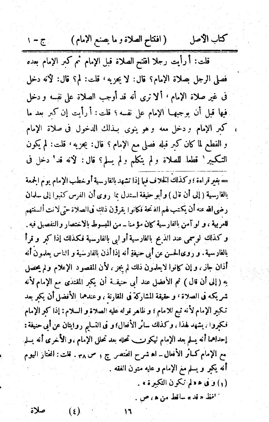 قلت أَرَأَيْت رجلا افْتتح الصَّلَاة قبل الإِمَام ثمَّ كبر الإِمَام بعده فصلى الرجل بِصَلَاة الإِمَام قَالَ لَا يجْزِيه قلت لم قَالَ لِأَنَّهُ دخل فِي غير صَلَاة الإِمَام أَلا ترى أَنه قد أوجب الصَّلَاة على نَفسه وَدخل فِيهَا قبل أَن يُوجِبهَا الإِمَام على نَفسه قلت أَرَأَيْت إِن كبر بعد مَا كبر الإِمَام وَدخل مَعَه وَهُوَ يَنْوِي بذلك الدُّخُول فِي صَلَاة الإِمَام وَالْقطع لما كَانَ كبر قبله فصلى مَعَ الإِمَام قَالَ يجْزِيه قلت لم يكون التَّكْبِير قطعا للصَّلَاة وَلم يتَكَلَّم وَلم يسلم قَالَ لِأَنَّهُ قد دخل فِي