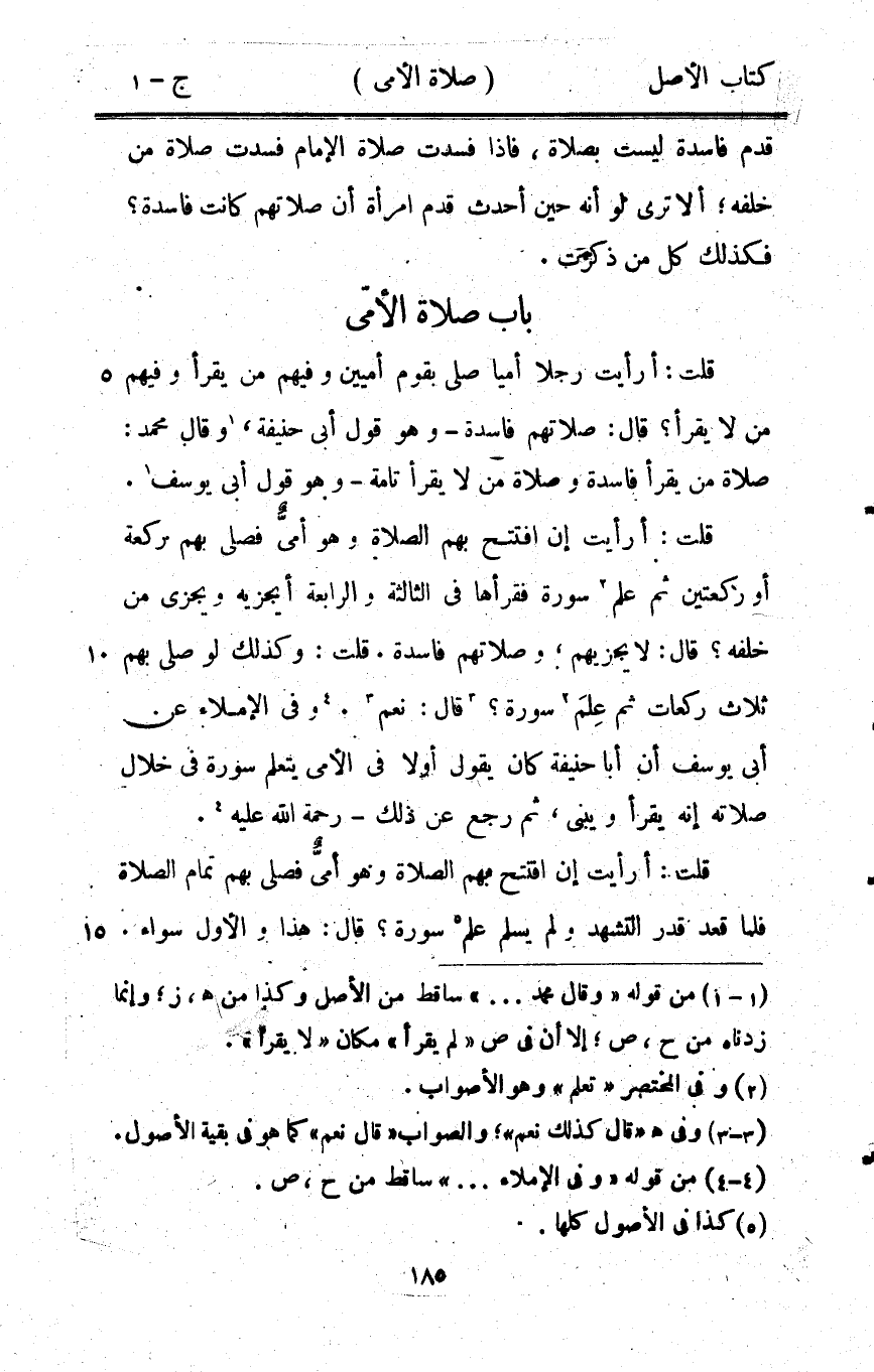 قلت أَرَأَيْت إِن افْتتح بهم الصَّلَاة وَهُوَ أُمِّي فصلى بهم رَكْعَة أَو رَكْعَتَيْنِ ثمَّ علم سُورَة فقرأها فِي الثَّالِثَة وَالرَّابِعَة أيجزيه وَيجْزِي من خَلفه قَالَ لَا يجزيهم وصلاتهم فَاسِدَة قلت وَكَذَلِكَ لَو صلى بهم ثَلَاث رَكْعَات ثمَّ علم سُورَة قَالَ نعم وَفِي الْإِمْلَاء عَن أبي يُوسُف أَن أَبَا حنيفَة كَانَ يَقُول أَولا فِي الْأُمِّي يتَعَلَّم سُورَة فِي خلال صلَاته إِنَّه يقْرَأ وَيَبْنِي ثمَّ رَجَعَ عَن ذَلِك رَحْمَة الله عَلَيْهِ