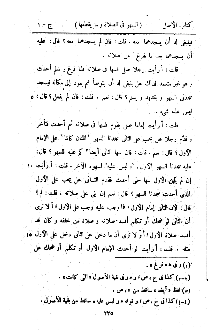 قلت أَرَأَيْت إِمَامًا صلى بِقوم فَسَهَا فِي صلَاته ثمَّ أحدث فَتَأَخر وَقدم رجلا هَل يجب على الثَّانِي سجدتا السَّهْو اللَّتَان كَانَتَا على الإِمَام الأول قَالَ نعم قلت فَإِن سَهَا الثَّانِي أَيْضا كم عَلَيْهِ للسَّهْو قَالَ عَلَيْهِ سجدتا السَّهْو الأول وَلَيْسَ عَلَيْهِ لسَهْوه الآخر قلت أَرَأَيْت إِن لم يكن الأول سَهَا حَتَّى أحدث فَقدم الثَّانِي هَل يجب على الأول الَّذِي أحدث سجدتا السَّهْو قَالَ نعم إِن بنى على صلَاته قلت لم قَالَ لِأَن الثَّانِي إِمَام الأول فَمَا وَجب عَلَيْهِ وَجب على الأول أَلا ترى أَن الثَّانِي لَو ضحك أَو تكلم أفسد صلَاته وَصَلَاة من خَلفه وَكَانَ قد أفسد صَلَاة الأول أَو لَا ترى أَن مَا دخل على الثَّانِي دخل على الأول مثله قلت أَرَأَيْت لَو أحدث الإِمَام الأول أَو تكلم أَو ضحك هَل