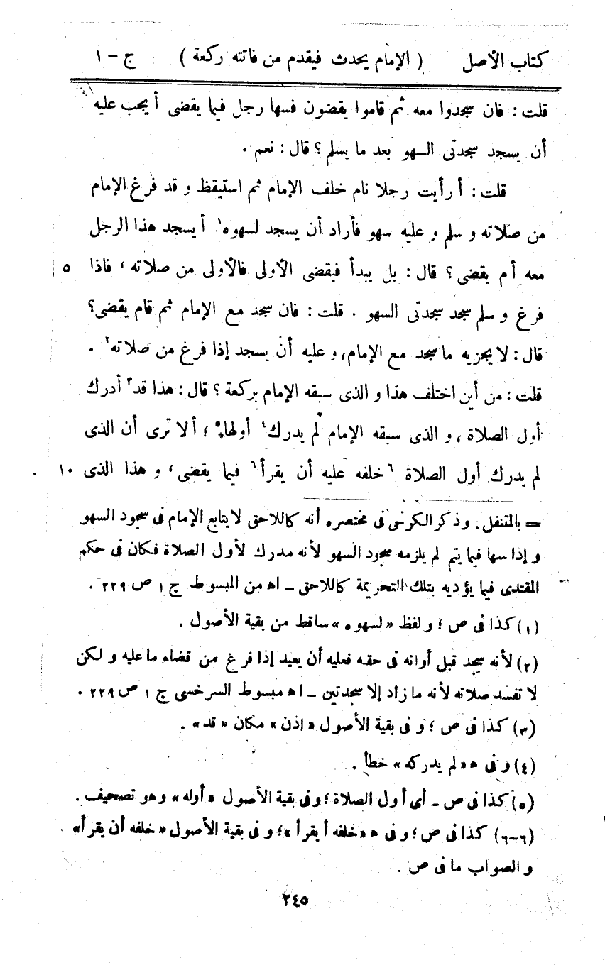 قلت أَرَأَيْت رجلا نَام خلف الإِمَام ثمَّ اسْتَيْقَظَ وَقد فرغ الإِمَام من صلَاته وَسلم وَعَلِيهِ سَهْو فَأَرَادَ أَن يسْجد لسَهْوه أيسجد هَذَا الرجل مَعَه أم يقْضِي قَالَ بل يبْدَأ فَيَقْضِي الأولى فَالْأولى من صلَاته فَإِذا فرغ وَسلم سجد سَجْدَتي السَّهْو قلت فَإِن سجد مَعَ الإِمَام ثمَّ قَامَ يقْضِي قَالَ لَا يجْزِيه مَا سجد مَعَ الإِمَام وَعَلِيهِ أَن يسْجد إِذا فرغ من صلَاته قلت من أَيْن اخْتلف هَذَا وَالَّذِي سبقه الإِمَام بِرَكْعَة قَالَ هَذَا قد أدْرك أول الصَّلَاة وَالَّذِي سبقه الإِمَام لم يدْرك أَولهَا أَلا ترى أَن الَّذِي لم يدْرك أول الصَّلَاة خَلفه عَلَيْهِ أَن يقْرَأ فِيمَا يقْضِي وَهَذَا الَّذِي
