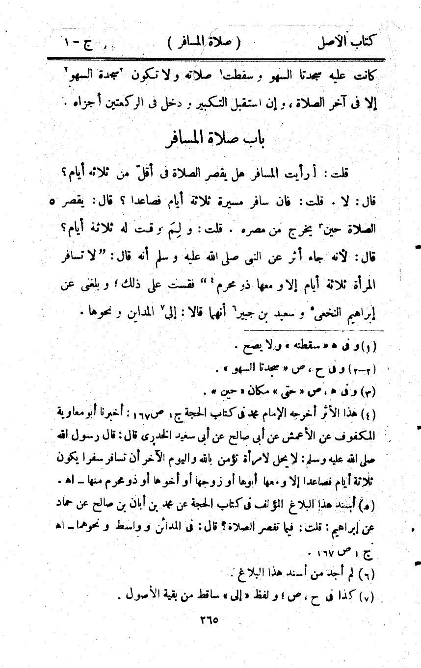 قلت أَرَأَيْت الْمُسَافِر هَل يقصر الصَّلَاة فِي أقل من ثَلَاثَة أَيَّام قَالَ لَا قلت فَإِن سَافر مسيرَة ثَلَاثَة أَيَّام فَصَاعِدا قَالَ يقصر الصَّلَاة حِين يخرج من مصره قلت وَلم وَقت لَهُ ثَلَاثَة أَيَّام قَالَ لِأَنَّهُ جَاءَ أثر عَن النَّبِي صلى الله عَلَيْهِ وَسلم أَنه قَالَ لَا تُسَافِر الْمَرْأَة ثَلَاثَة أَيَّام إِلَّا وَمَعَهَا ذُو محرم فقست على ذَلِك وَبَلغنِي عَن إِبْرَاهِيم النَّخعِيّ وَسَعِيد بن جُبَير أَنَّهُمَا قَالَا إِلَى المداين وَنَحْوهَا