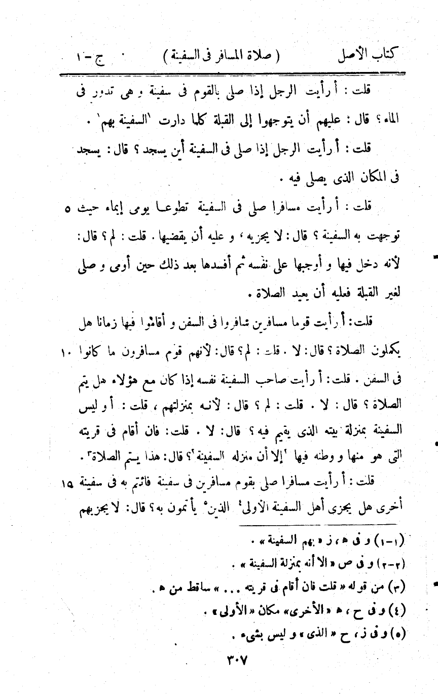 قلت أَرَأَيْت قوما مسافرين سافروا فِي السفن وَأَقَامُوا فِيهَا زَمَانا هَل يكملون الصَّلَاة قَالَ لَا قلت لم قَالَ لأَنهم قوم مسافرون مَا كَانُوا فِي السفن قلت أَرَأَيْت صَاحب السَّفِينَة نَفسه إِذا كَانَ مَعَ هَؤُلَاءِ هَل يتم الصَّلَاة قَالَ لَا قلت لم قَالَ لِأَنَّهُ بمنزلتهم قلت أَو لَيْسَ السَّفِينَة بِمَنْزِلَة بَيته الَّذِي يُقيم فِيهِ قَالَ لَا قلت فَإِن أَقَامَ فِي قريته الَّتِي هُوَ مِنْهَا ووطنه فِيهَا إِلَّا أَن منزله السَّفِينَة قَالَ هَذَا يتم الصَّلَاة