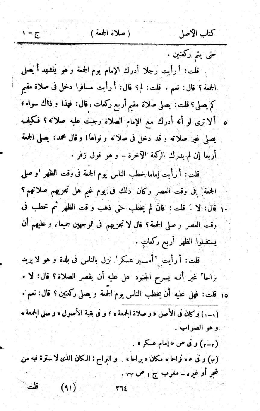 قلت أَرَأَيْت رجلا أدْرك الإِمَام يَوْم الْجُمُعَة وَهُوَ يتَشَهَّد أيصلي الْجُمُعَة قَالَ نعم قلت لم قَالَ أَرَأَيْت مُسَافِرًا دخل فِي صَلَاة مُقيم كم يُصَلِّي قلت يُصَلِّي صَلَاة مُقيم أَربع رَكْعَات قَالَ فَهَذَا وَذَاكَ سَوَاء أَلا ترى لَو أَنه أدْرك مَعَ الإِمَام الصَّلَاة وَجَبت عَلَيْهِ صلَاته فَكيف يُصَلِّي غير صلَاته وَقد دخل فِي صلَاته ونواها وَقَالَ مُحَمَّد يُصَلِّي الْجُمُعَة أَرْبعا إِن لم يدْرك الرَّكْعَة الْآخِرَة وَهُوَ قَول زفر