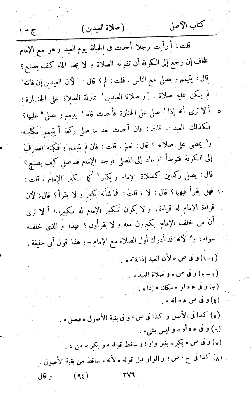 قلت أَرَأَيْت رجلا أحدث فِي الْجَبانَة يَوْم الْعِيد وَهُوَ مَعَ الإِمَام فخاف إِن رَجَعَ إِلَى الْكُوفَة أَن تفوته الصَّلَاة وَلَا يجد المَاء كَيفَ يصنع قَالَ يتَيَمَّم وَيُصلي مَعَ النَّاس قلت لم قَالَ لِأَن الْعِيدَيْنِ إِن فَاتَتْهُ لم يكن عَلَيْهِ صَلَاة وَصَلَاة الْعِيدَيْنِ بِمَنْزِلَة الصَّلَاة على الْجِنَازَة أَلا ترى أَنه إِذا صلى على الْجِنَازَة فأحدث فَإِنَّهُ يتَيَمَّم وَيُصلي عَلَيْهَا فَكَذَلِك الْعِيد قلت فَإِن أحدث بعد مَا صلى رَكْعَة أيتيمم مَكَانَهُ ويمضي على صلَاته قَالَ نعم قلت فَإِن لم يتَيَمَّم وَلكنه انْصَرف إِلَى الْكُوفَة فَتَوَضَّأ ثمَّ عَاد إِلَى الْمصلى فَوجدَ الإِمَام قد صلى كَيفَ يصنع قَالَ يُصَلِّي رَكْعَتَيْنِ كَصَلَاة الإِمَام وَيكبر كَمَا يكبر الإِمَام قلت فَهَل يقْرَأ فيهمَا قَالَ لَا قلت فَمَا شَأْنه يكبر وَلَا يقْرَأ قَالَ لِأَن قِرَاءَة الإِمَام لَهُ قِرَاءَة وَلَا يكون تَكْبِير الإِمَام لَهُ تَكْبِيرا أَلا ترى أَن من خلف الإِمَام يكبرُونَ مَعَه وَلَا يقرأون فَهَذَا وَالَّذِي خَلفه سَوَاء وَلِأَنَّهُ قد أدْرك أول الصَّلَاة مَعَ الإِمَام وَهَذَا قَول أبي حنيفَة