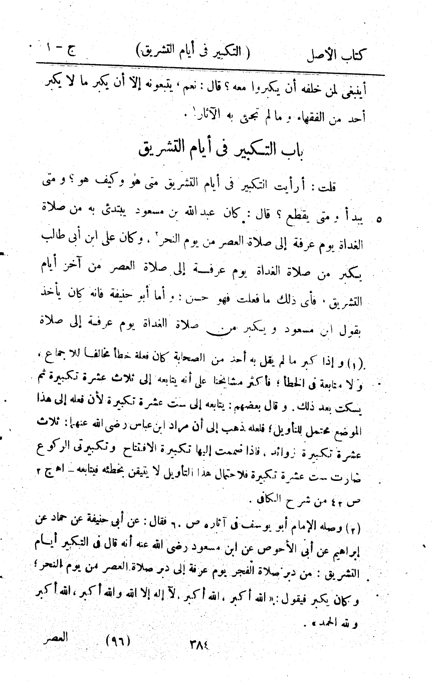 قلت أَرَأَيْت التَّكْبِير فِي أَيَّام التَّشْرِيق مَتى هُوَ وَكَيف هُوَ وَمَتى يبْدَأ وَمَتى يقطع قَالَ كَانَ عبد الله بن مَسْعُود يَبْتَدِئ بِهِ من صَلَاة الْغَدَاة يَوْم عَرَفَة إِلَى صَلَاة الْعَصْر من يَوْم النَّحْر وَكَانَ عَليّ ابْن أبي طَالب يكبر من صَلَاة الْغَدَاة يَوْم عَرَفَة إِلَى صَلَاة الْعَصْر من آخر أَيَّام التَّشْرِيق فَأَي ذَلِك مَا فعلت فَهُوَ حسن وَأما أَبُو حنيفَة فَإِنَّهُ كَانَ يَأْخُذهُ بقول ابْن مَسْعُود وَيكبر من صَلَاة الْغَدَاة يَوْم عَرَفَة إِلَى صَلَاة