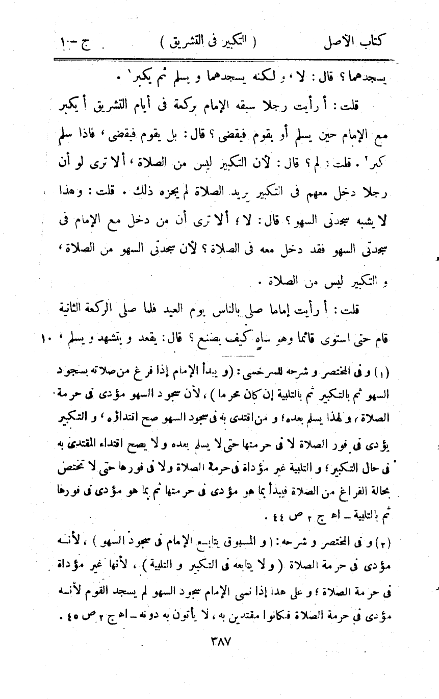 قلت أَرَأَيْت رجلا سبقه الإِمَام بِرَكْعَة فِي أَيَّام التَّشْرِيق أيكبر مَعَ الإِمَام حِين يسلم أَو يقوم فَيَقْضِي قَالَ بل يقوم فَيَقْضِي فَإِذا سلم كبر قلت لم قَالَ لِأَن التَّكْبِير لَيْسَ من الصَّلَاة أَلا ترى لَو أَن رجلا دخل مَعَهم فِي التَّكْبِير يُرِيد الصَّلَاة لم يجزه ذَلِك قلت وَهَذَا لَا يشبه سَجْدَتي السَّهْو قَالَ لَا أَلا ترى أَن من دخل مَعَ الإِمَام فِي سَجْدَتي السَّهْو فقد دخل مَعَه فِي الصَّلَاة لِأَن سَجْدَتي السَّهْو من الصَّلَاة وَالتَّكْبِير لَيْسَ من الصَّلَاة