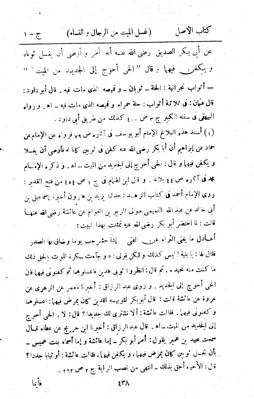 عَن أبي بكر الصّديق رَضِي الله عَنهُ أَنه أَمر وَأوصى أَن يغسل ثوباه ويكفن فيهمَا وَقَالَ الْحَيّ أحْوج إِلَى الْجَدِيد من الْمَيِّت