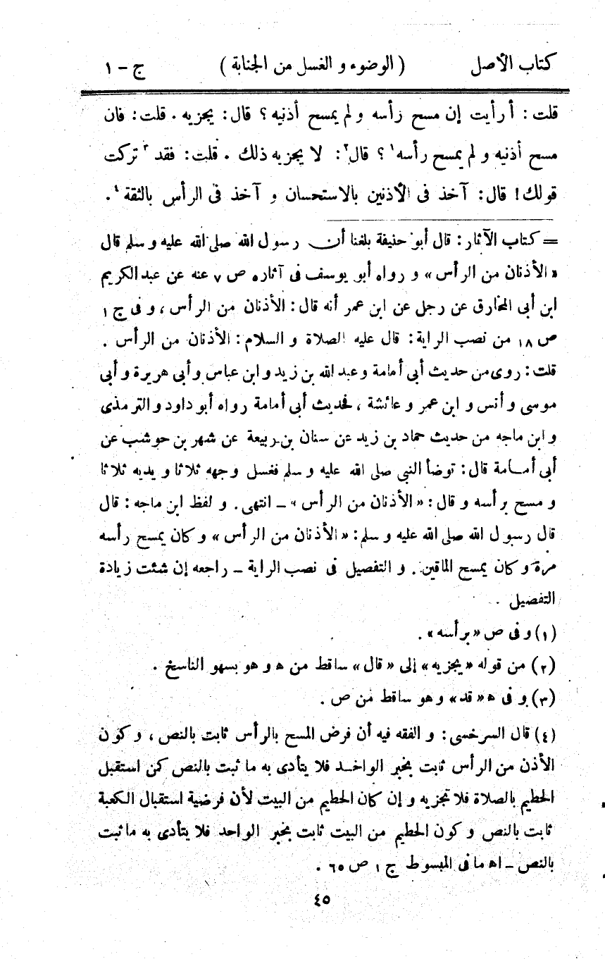 قلت أَرَأَيْت إِن مسح رَأسه وَلم يمسح أُذُنَيْهِ قَالَ يجْزِيه قلت فَإِن مسح أُذُنَيْهِ وَلم يمسح رَأسه قَالَ لَا يجْزِيه ذَلِك قلت فقد تركت قَوْلك قَالَ آخذ فِي الْأُذُنَيْنِ بالاستحسان وآخذ فِي الرَّأْس بالثقة