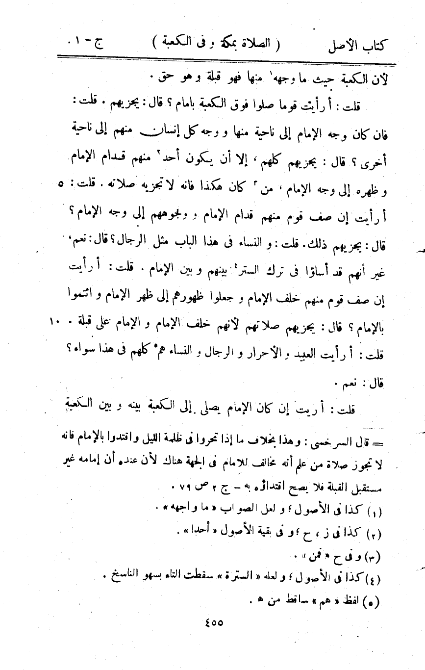 قلت أَرَأَيْت قوما صلوا فَوق الْكَعْبَة بِإِمَام قَالَ يجزيهم قلت فَإِن كَانَ وَجه الإِمَام إِلَى نَاحيَة مِنْهَا وَوجه كل إِنْسَان مِنْهُم إِلَى نَاحيَة أُخْرَى قَالَ يجزيهم كلهم إِلَّا أَن يكون أحد مِنْهُم قُدَّام الإِمَام وظهره إِلَى وَجه الإِمَام من كَانَ هَكَذَا فَإِنَّهُ لَا تجزيه صلَاته قلت أَرَأَيْت إِن صف قوم مِنْهُم قُدَّام الإِمَام ووجوههم إِلَى وَجه الإِمَام قَالَ يجزيهم ذَلِك قلت وَالنِّسَاء فِي هَذَا الْبَاب مثل الرِّجَال قَالَ نعم غير أَنهم قد أساؤا فِي ترك السّتْر بَينهم وَبَين الإِمَام قلت أَرَأَيْت إِن صف قوم مِنْهُم خلف الإِمَام وَجعلُوا ظُهُورهمْ إِلَى ظهر الإِمَام وائتموا بِالْإِمَامِ قَالَ يجزيهم صلَاتهم لأَنهم خلف الإِمَام وَالْإِمَام على قبْلَة قلت أَرَأَيْت العبيد والأحرار وَالرِّجَال وَالنِّسَاء هم كلهم فِي هَذَا سَوَاء قَالَ نعم