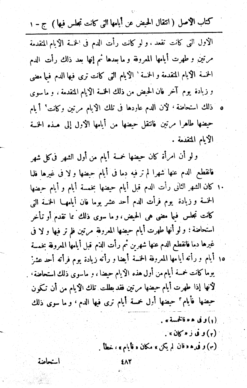 الأول الَّتِي كَانَت تقعد وَلَو كَانَت رَأَتْ الدَّم فِي الْخَمْسَة الْأَيَّام الْمُتَقَدّمَة مرَّتَيْنِ وطهرت أَيَّامهَا الْمَعْرُوفَة وَمَا بعْدهَا ثمَّ إِنَّهَا بعد ذَلِك رَأَتْ الدَّم الْخَمْسَة الْأَيَّام الْمُتَقَدّمَة والخمسة الْأَيَّام الَّتِي كَانَت ترى فِيهَا الدَّم فِيمَا مضى وَزِيَادَة يَوْم آخر فَإِن الْحيض من ذَلِك الْخَمْسَة الْأَيَّام الْمُتَقَدّمَة وَمَا سوى ذَلِك اسْتِحَاضَة لِأَن الدَّم عاودها فِي تِلْكَ الْأَيَّام مرَّتَيْنِ وَكَانَت أَيَّام حَيْضهَا طَاهِرا مرَّتَيْنِ فانتقل حَيْضهَا من أَيَّامهَا الأول إِلَى هَذِه الْخَمْسَة الْأَيَّام الْمُتَقَدّمَة
