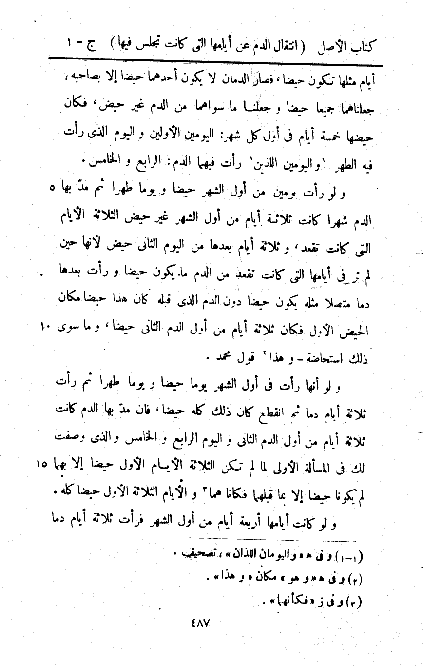 أَيَّام مثلهَا تكون حيضا فَصَارَ الدمَان لَا يكون أَحدهمَا حيضا إِلَّا بِصَاحِبِهِ جعلناهما جَمِيعًا حيضا وَجَعَلنَا مَا سواهُمَا من الدَّم غير حيض فَكَانَ حَيْضهَا خَمْسَة أَيَّام فِي أول كل شهر الْيَوْمَيْنِ الْأَوَّلين وَالْيَوْم الَّذِي رَأَتْ فِيهِ الطُّهْر واليومين اللَّذين رَأَتْ فيهمَا الدَّم الرَّابِع وَالْخَامِس