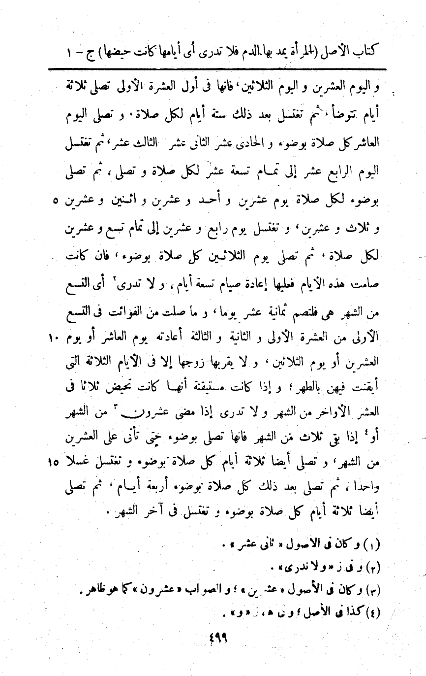 وَالْيَوْم الْعشْرين وَالْيَوْم الثَّلَاثِينَ فَإِنَّهَا فِي أول الْعشْرَة الأولى تصلي ثَلَاثَة أَيَّام تتوضأ ثمَّ تَغْتَسِل بعد ذَلِك سِتَّة أَيَّام لكل صَلَاة وَتصلي الْيَوْم الْعَاشِر كل صَلَاة بِوضُوء وَالْحَادِي عشر الثَّانِي عشر الثَّالِث عشر ثمَّ تَغْتَسِل الْيَوْم الرَّابِع عشر إِلَى تَمام تِسْعَة عشر لكل صَلَاة وَتصلي ثمَّ تصلي بِوضُوء لكل صَلَاة يَوْم عشْرين وَاحِد وَعشْرين واثنين وَعشْرين وَثَلَاث وَعشْرين وتغتسل يَوْم رَابِع وَعشْرين إِلَى تَمام تسع وَعشْرين لكل صَلَاة ثمَّ تصلي يَوْم الثَّلَاثِينَ كل صَلَاة بِوضُوء فَإِن كَانَت صَامت هَذِه الْأَيَّام فعلَيْهَا إِعَادَة صِيَام تِسْعَة أَيَّام وَلَا تَدْرِي أَي التسع من الشَّهْر هِيَ فلتصم ثَمَانِيَة عشر يَوْمًا وَمَا صلت من الْفَوَائِت فِي التسع الأولى من الْعشْرَة الأولى وَالثَّانيَِة وَالثَّالِثَة أعادته يَوْم الْعَاشِر أَو يَوْم الْعشْرين أَو يَوْم الثَّلَاثِينَ وَلَا يقربهَا زَوجهَا إِلَّا فِي الْأَيَّام الثَّلَاثَة الَّتِي أيقنت فِيهِنَّ بِالطُّهْرِ وَإِذا كَانَت مستيقنة أَنَّهَا كَانَت تحيض ثَلَاثًا فِي الْعشْر الْأَوَاخِر من الشَّهْر وَلَا تَدْرِي إِذا مضى عشرُون من الشَّهْر أَو إِذا بَقِي ثَلَاث من الشَّهْر فَإِنَّهَا تصلي بِوضُوء حَتَّى تَأتي على الْعشْرين من الشَّهْر وَتصلي أَيْضا ثَلَاثَة أَيَّام كل صَلَاة بِوضُوء وتغتسل غسلا وَاحِدًا ثمَّ تصلي بعد ذَلِك كل صَلَاة بِوضُوء أَرْبَعَة أَيَّام ثمَّ تصلي أَيْضا ثَلَاثَة أَيَّام كل صَلَاة بِوضُوء وتغتسل فِي آخر الشَّهْر