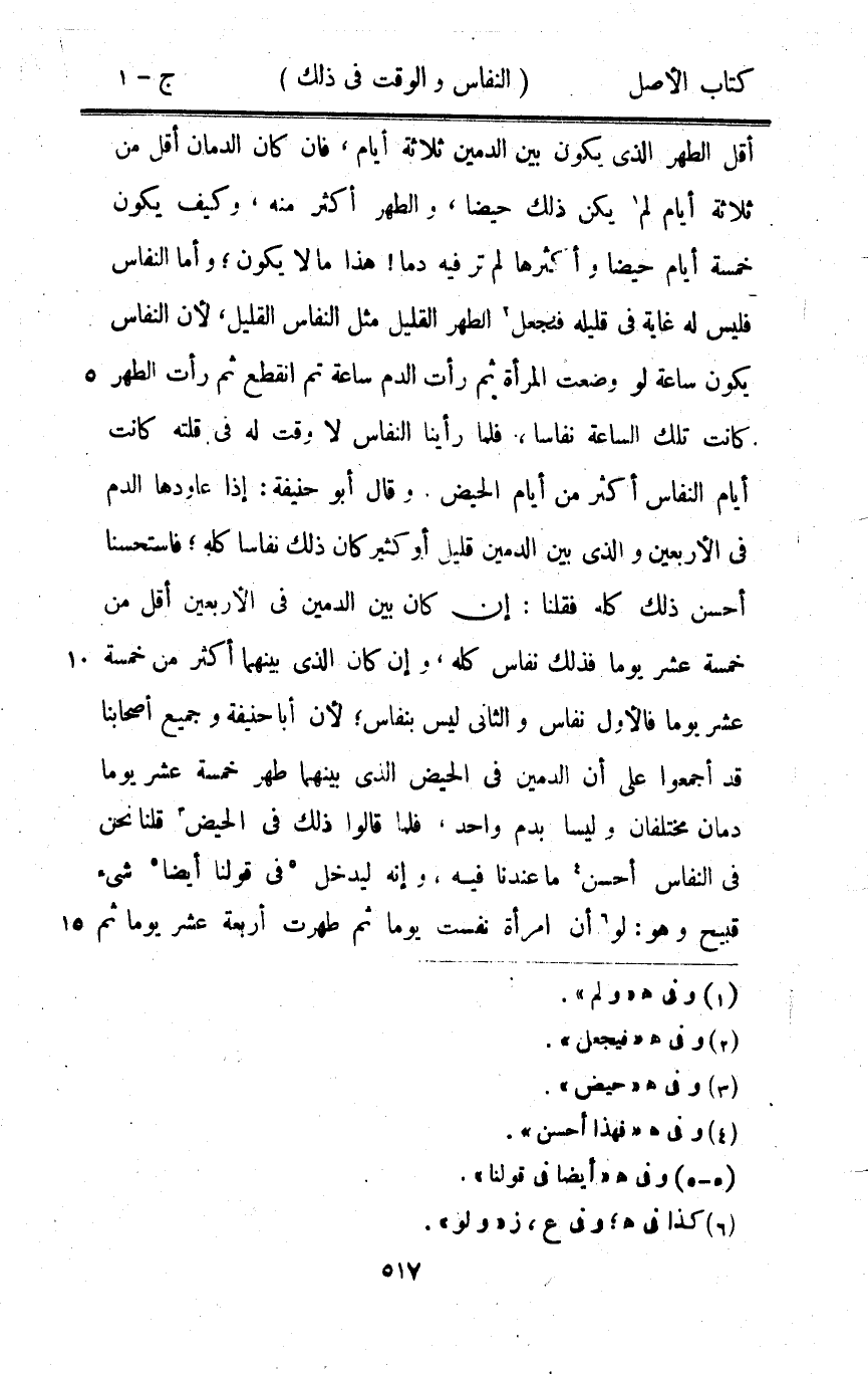 أقل الطُّهْر الَّذِي يكون بَين الدمين ثَلَاثَة أَيَّام فَإِن كَانَ الدمَان أقل من ثَلَاثَة أَيَّام لم يكن ذَلِك حيضا وَالطُّهْر أَكثر مِنْهُ وَكَيف يكون خَمْسَة أَيَّام حيضا وأكثرها لم تَرَ فِيهِ دَمًا هَذَا مَا لَا يكون وَأما النّفاس فَلَيْسَ لَهُ غَايَة فِي قَلِيله فَنَجْعَل الطُّهْر الْقَلِيل مثل النّفاس الْقَلِيل لِأَن النّفاس يكون سَاعَة لَو وضعت الْمَرْأَة ثمَّ رَأَتْ الدَّم سَاعَة ثمَّ انْقَطع ثمَّ رَأَتْ الطُّهْر كَانَت تِلْكَ السَّاعَة نفاسا فَلَمَّا رَأينَا النّفاس لَا وَقت لَهُ فِي قلته كَانَت أَيَّام النّفاس أَكثر من أَيَّام الْحيض وَقَالَ أَبُو حنيفَة إِذا عاودها الدَّم فِي الْأَرْبَعين وَالَّذِي بَين الدمين قَلِيل أَو كثير كَانَ ذَلِك نفاسا كُله فاستحسنا أحسن ذَلِك كُله فَقُلْنَا إِن كَانَ بَين الدمين فِي الْأَرْبَعين أقل من خَمْسَة عشر يَوْمًا فَذَلِك نِفَاس كُله وَإِن كَانَ الَّذِي بَينهمَا أَكثر من خَمْسَة عشر يَوْمًا فَالْأول نِفَاس وَالثَّانِي لَيْسَ بنفاس لِأَن أَبَا حنيفَة وَجَمِيع أَصْحَابنَا قد أَجمعُوا على أَن الدمين فِي الْحيض الَّذِي بَينهمَا طهر خَمْسَة عشر يَوْمًا دمان مُخْتَلِفَانِ وليسا بِدَم وَاحِد فَلَمَّا قَالُوا ذَلِك فِي الْحيض قُلْنَا نَحن فِي النّفاس أحسن مَا عندنَا فِيهِ وَإنَّهُ ليدْخل فِي قَوْلنَا أَيْضا شَيْء قَبِيح وَهُوَ لَو أَن امْرَأَة نفست يَوْمًا ثمَّ طهرت أَرْبَعَة عشر يَوْمًا ثمَّ