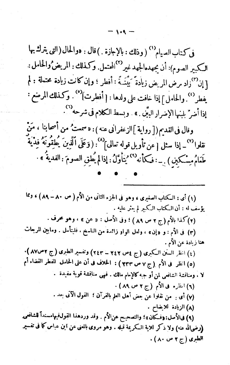 (5) انْظُر فى الْأُم (ج 7 ص 233) : الْخلاف فى أَن على الْحَامِل الْمُفطر الْقَضَاء أم لَا، ومناقشة الشَّافِعِي لمن أوجبه كَالْإِمَامِ مَالك. فهى مناقشة قَوِيَّة مفيدة.