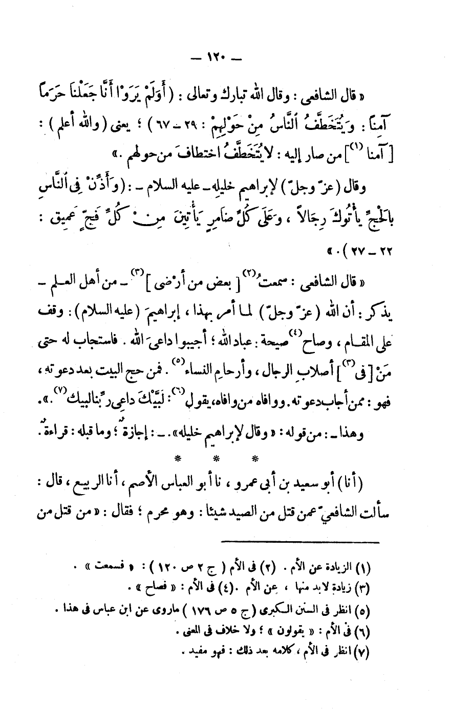 «قَالَ الشَّافِعِيُّ: وَقَالَ اللَّهُ تَبَارَكَ وَتَعَالَى: (أَوَلَمْ يَرَوْا أَنَّا جَعَلْنا حَرَماً آمِناً: وَيُتَخَطَّفُ النَّاسُ مِنْ حَوْلِهِمْ: 29- 67) يَعْنِي (وَاَللَّهُ أَعْلَمُ) :