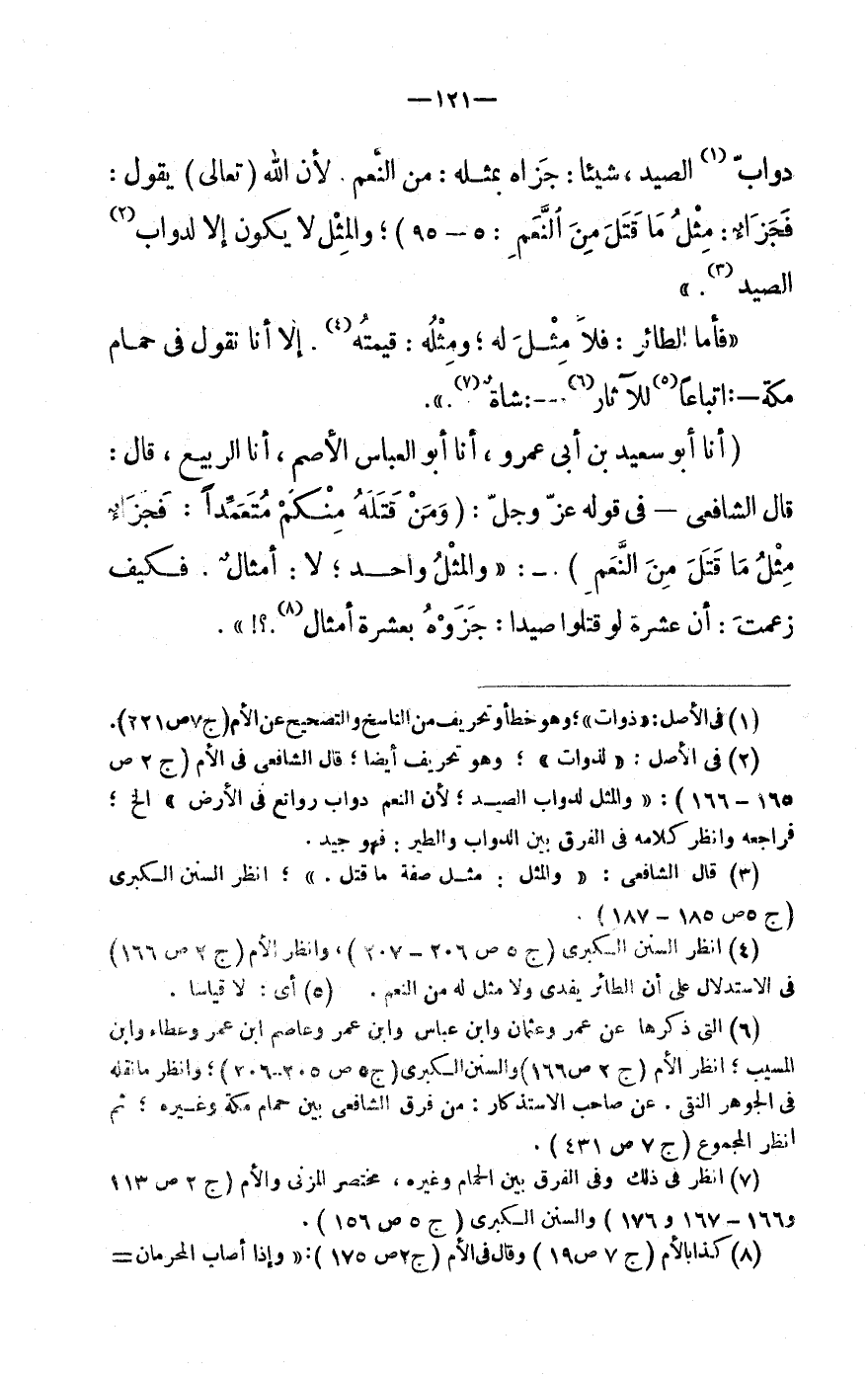 (8) كَذَا بِالْأُمِّ (ج 7 ص 19) وَقَالَ فى الْأُم (ج 2 ص 175) : «وَإِذا أصَاب المحرمان- أَو الْجَمَاعَة صيدا: فَعَلَيْهِم كلهم جَزَاء وَاحِد» وَنقل مثل ذَلِك عَن عَمْرو عبد الرَّحْمَن بن عَوْف وَابْن عمر وَعَطَاء ثمَّ قَالَ (ص 175- 176) : «وَهَذَا مُوَافق لكتاب الله عز وَجل:
