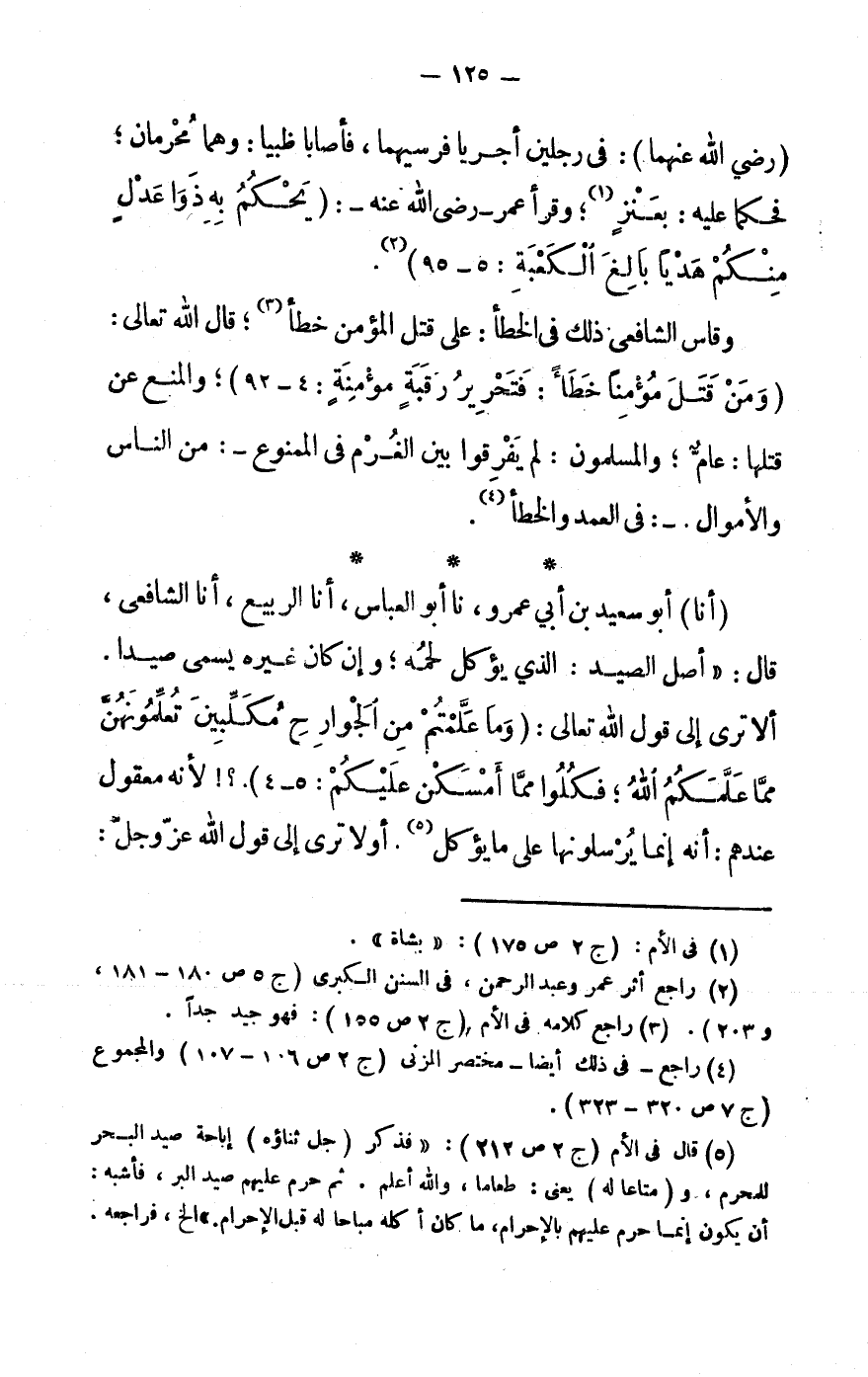 (5) قَالَ فى الْأُم (ج 2 ص 212) : «فَذكر (جلّ ثَنَاؤُهُ) إِبَاحَة صيد الْبَحْر للْمحرمِ، و (مَتَاعا لَهُ) يعْنى: طَعَاما، وَالله أعلم. ثمَّ حرم عَلَيْهِم صيد الْبر، فَأشبه: