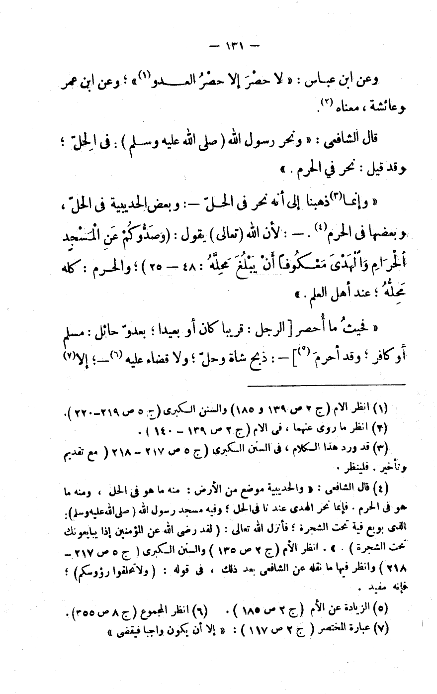 (4) قَالَ الشَّافِعِي: «وَالْحُدَيْبِيَة مَوضِع من الأَرْض: مِنْهُ مَا هُوَ فى الْحل، وَمِنْه مَا هُوَ فى الْحرم. فَإِنَّمَا نحر الْهدى عندنَا فى الْحل وَفِيه مَسْجِد رَسُول الله (صَلَّى اللهُ عَلَيْهِ وَسَلَّمَ) :