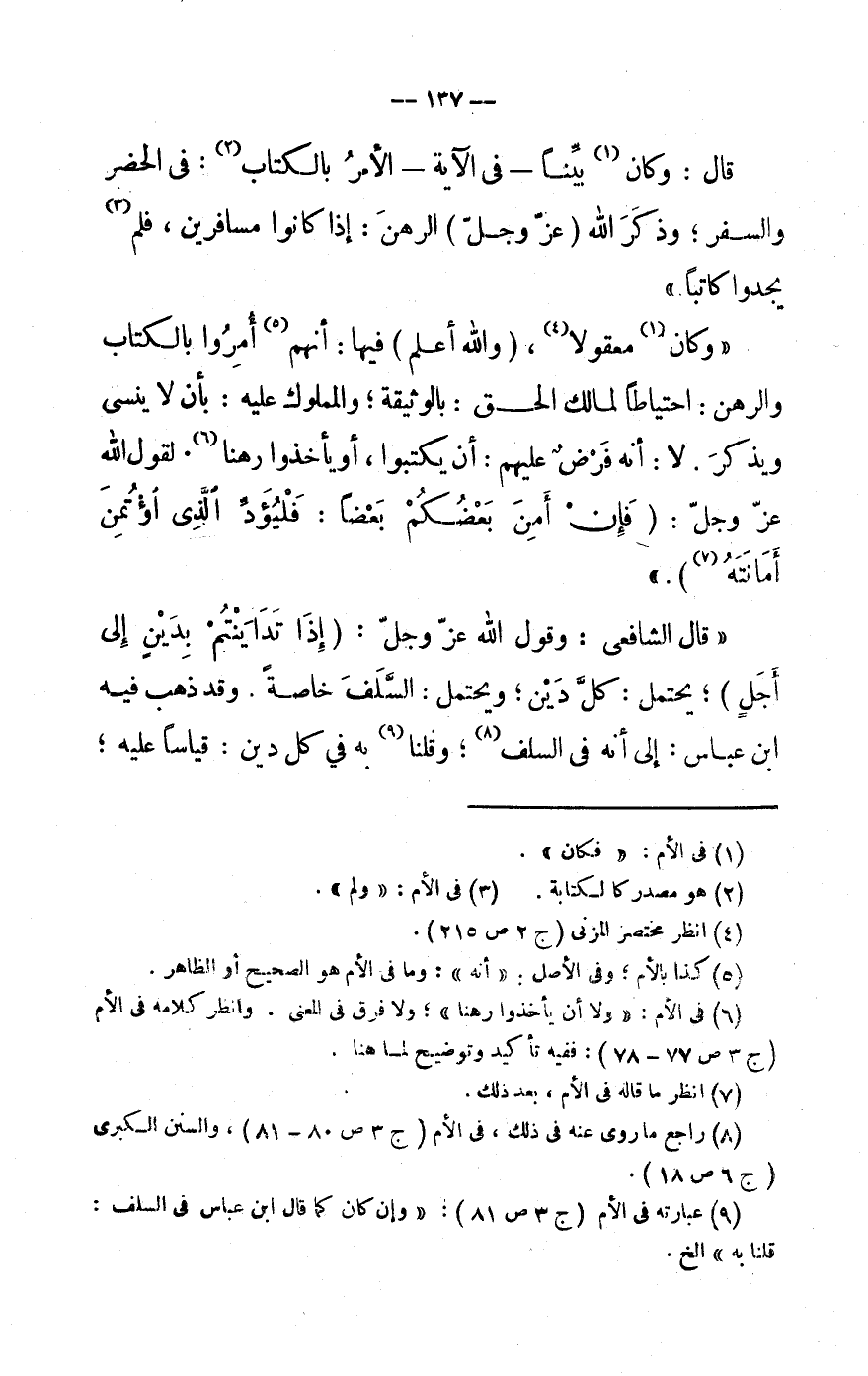 (7) فى الْأُم: «وَلَا أَن يَأْخُذُوا رهنا» وَلَا فرق فى الْمَعْنى. وَانْظُر كَلَامه فى الْأُم (ج 3 ص 77- 78) : فَفِيهِ تَأْكِيد وتوضيح لما هُنَا.
