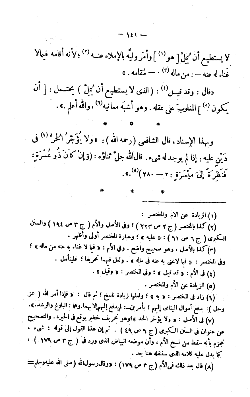 (8) قَالَ بعد ذَلِك فى الْأُم (ج 3 ص 179) : «وَقَالَ رَسُول الله (صَلَّى اللهُ عَلَيْهِ وَسَلَّمَ-: «مطل الْغنى ظلم» . فَلم يَجْعَل على ذى دين سَبِيلا فى الْعسرَة، حَتَّى تكون الميسرة. وَلم يَجْعَل رَسُول الله (صَلَّى اللهُ عَلَيْهِ وَسَلَّمَ) مطله ظلما، إِلَّا بالغنى. فَإِذا كَانَ مُعسرا: فَهُوَ لَيْسَ مِمَّن عَلَيْهِ سَبِيل، إِلَّا أَن يوسر. وَإِذا لم يكن عَلَيْهِ سَبِيل: فَلَا سَبِيل على إِجَارَته، لِأَن إِجَارَته عمل بدنه. وَإِذا لم يكن على بدنه سَبِيل- وَإِنَّمَا السَّبِيل على مَاله-: لم يكن إِلَى اسْتِعْمَاله سَبِيل» . اهـ وَهُوَ فى غَايَة الْجَوْدَة والوضوح.
