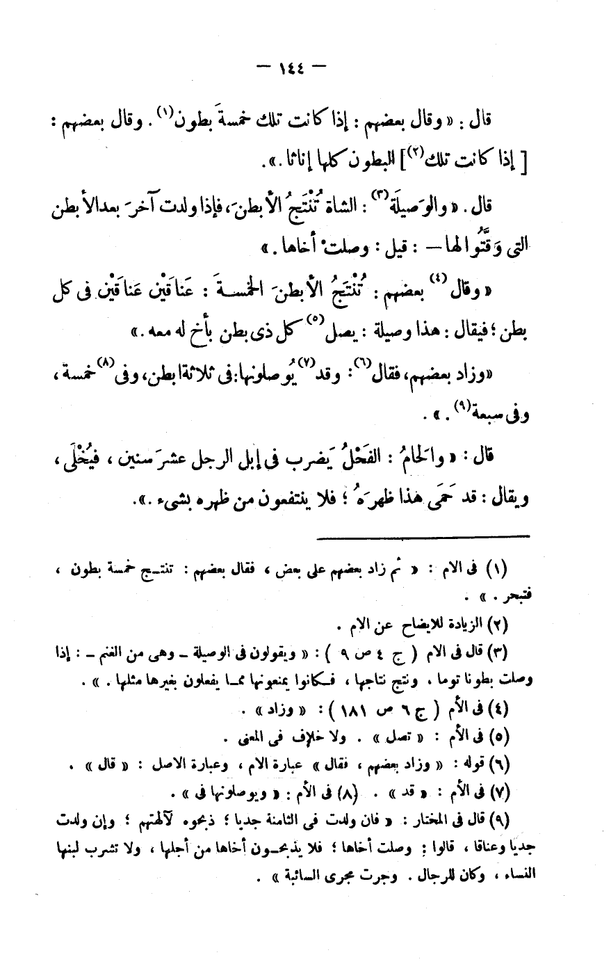 (3) قَالَ فى الام (ج 4 ص 9) : «وَيَقُولُونَ فى الوصيلة- وهى من الْغنم-: إِذا وصلت بطونا توما، ونتج نتاجها، فَكَانُوا يمنعونها مِمَّا يَفْعَلُونَ بغَيْرهَا مثلهَا.» .