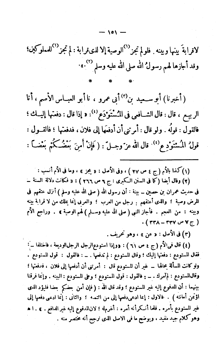 (3) وَقَالَ أَيْضا (كَمَا فى السّنَن الْكُبْرَى: ج 6 ص 266) : «فَكَانَت دلَالَة السّنة- فى حَدِيث عمرَان بن حُصَيْن- بَيِّنَة: أَن رَسُول الله (صَلَّى اللهُ عَلَيْهِ وَسَلَّمَ) أنزل عتقهم فى الْمَرَض وَصِيَّة وَالَّذِي أعتقهم: رجل من الْعَرَب والعربي إِنَّمَا يملك من لَا قرَابَة بَينه وَبَينه: من الْعَجم. فَأجَاز النَّبِي (صَلَّى اللهُ عَلَيْهِ وَسَلَّمَ) لَهُم الْوَصِيَّة» . وراجع الْأُم (ج 7 ص 337- 338) .