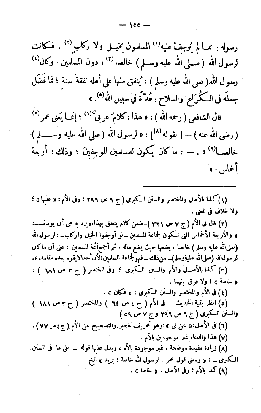 (8) زِيَادَة مفيدة مُوضحَة، غير مَوْجُودَة بِالْأُمِّ، وَيدل عَلَيْهَا قَوْله- على مَا فى السّنَن الْكُبْرَى-: «وَمعنى قَول عمر: لرَسُول الله خَاصَّة يُرِيد» إِلَخ.