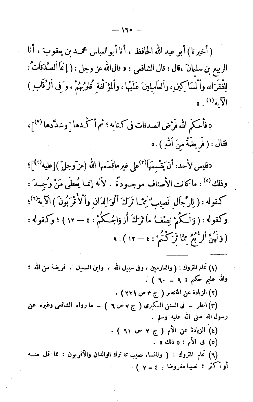 (أَخْبَرَنَا) أَبُو عَبْدِ اللَّهِ الْحَافِظُ، أَنَا أَبُو الْعَبَّاسِ مُحَمَّدُ بْنُ يَعْقُوبَ، أَنَا الرَّبِيعُ بْنُ سُلَيْمَانَ، قَالَ: قَالَ الشَّافِعِيُّ: «قَالَ اللَّهُ عَزَّ وَجَلَّ: (إِنَّمَا الصَّدَقاتُ: لِلْفُقَراءِ، وَالْمَساكِينِ، وَالْعامِلِينَ عَلَيْها، وَالْمُؤَلَّفَةِ قُلُوبُهُمْ، وَفِي الرِّقابِ) الْآيَةُ «1» .»