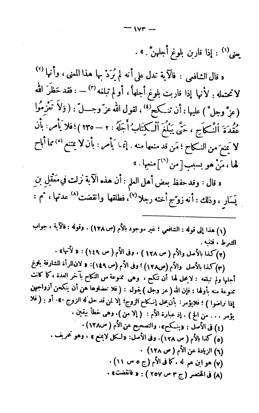 (3) كَذَا بِالْأَصْلِ وَالأُم (ص 128) وفى الْأُم (ص 149) : «لَان الْمَرْأَة المشارفة بُلُوغ أجلهَا وَلم تبلغه: لَا يحل لَهَا أَن تنْكح، وهى مَمْنُوعَة من النِّكَاح بآخر الْعدة، كَمَا كَانَت مَمْنُوعَة مِنْهُ بأولها: فَإِن الله (عز وَجل) يَقُول: (فَلا تَعْضُلُوهُنَّ أَنْ يَنْكِحْنَ أَزْواجَهُنَّ إِذا تَراضَوْا) فَلَا يُؤمر: بِأَن يحل إنكاح الزَّوْج إِلَّا لمن قد حل لَهُ الزَّوْج.» . أَو: (فَلَا يُؤمر ... من إِلَخ) . إِذْ عبارَة الْأُم: (إِلَّا من) ، وهى خطأ بِيَقِين.