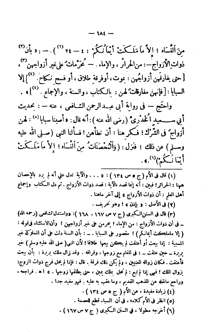 (1) قَالَ فى الْأُم (ج 5 ص 134) : « ... وَالْآيَة تدل عَليّ أَنه لم يرد بالإحصان هَاهُنَا: الْحَرَائِر فَبين: أَنه إِنَّمَا قصد بِالْآيَةِ: قصد ذَوَات الْأزْوَاج. ثمَّ دلّ الْكتاب وَإِجْمَاع أهل الْعلم: أَن ذَوَات الْأزْوَاج» إِلَى آخر مَا هُنَا.