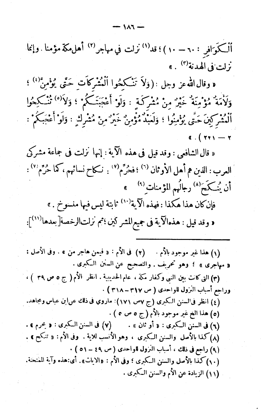 «قَالَ الشَّافِعِيُّ: وَقَدْ قِيلَ فِي هَذِهِ الْآيَةِ: إنَّهَا نَزَلَتْ فِي جَمَاعَةِ مُشْرِكِي الْعَرَبِ: الَّذِينَ هُمْ أَهْلِ الْأَوْثَانِ «6» فَحَرَّمَ «7» : نِكَاحَ نِسَائِهِمْ، كَمَا حَرَّمَ «8» :