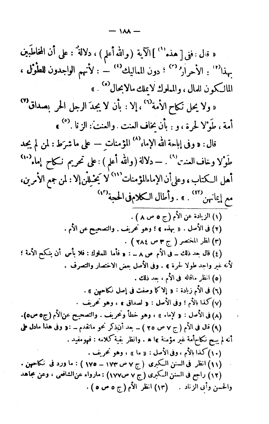 (10) قَالَ فى الْأُم (ج 7 ص 25) - بعد أَن ذكر نَحْو مَا تقدم-: «وفى هَذَا مَا دلّ على أَنه لم يبح نِكَاح أمة غير مُؤمنَة» اهـ. وَانْظُر بَقِيَّة كَلَامه: فَهُوَ مُفِيد.