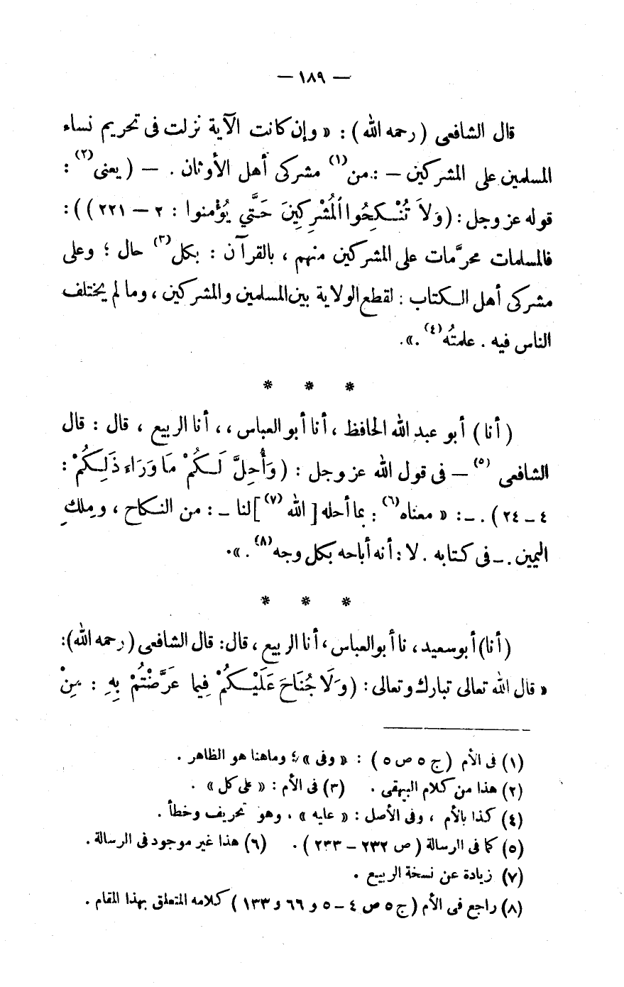 (8) رَاجع فى الْأُم (ج 5 ص 4- 5 و66 و133) كَلَامه الْمُتَعَلّق بِهَذَا الْمقَام.