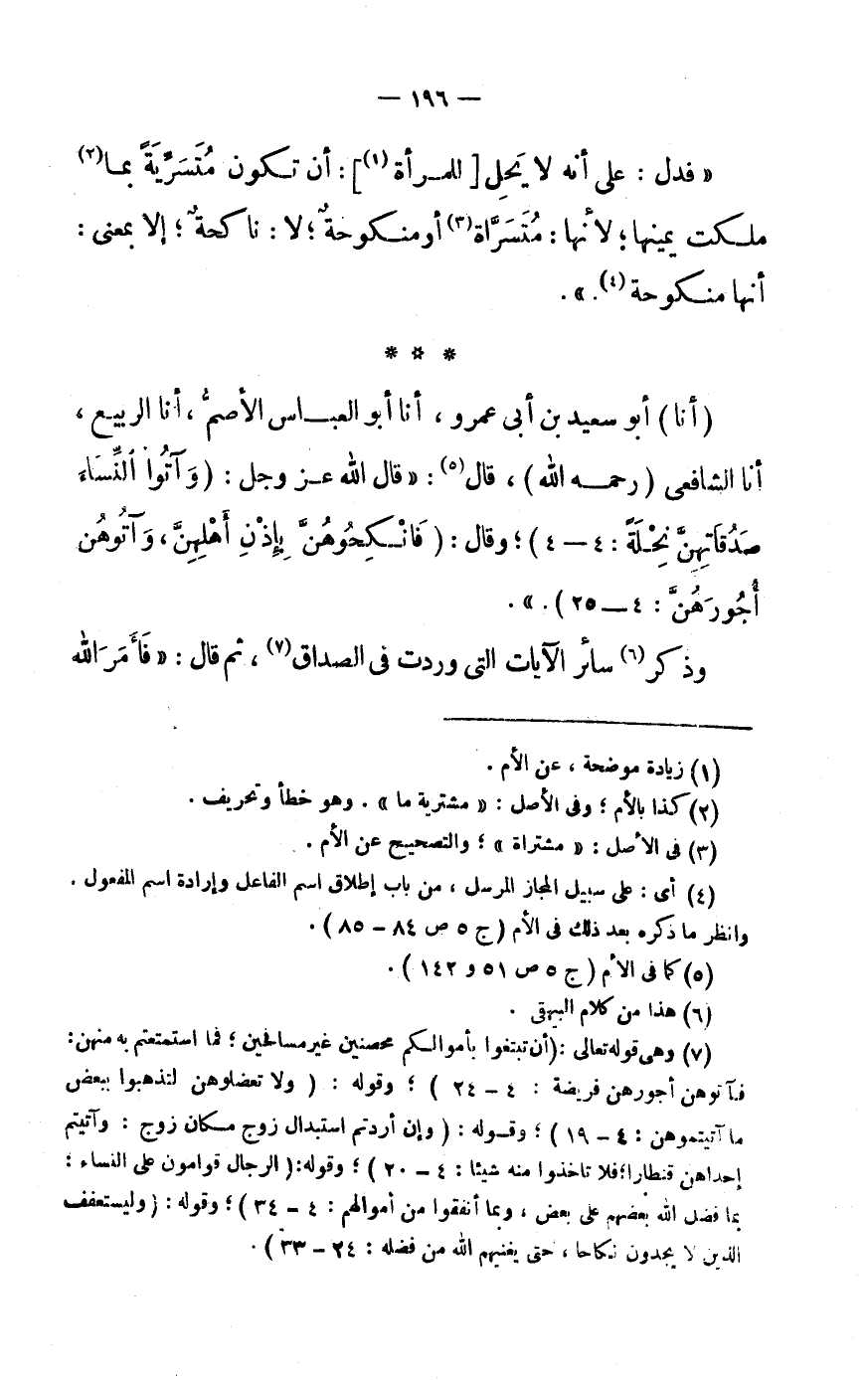 (أَنَا) أَبُو سَعِيدِ بْنُ أَبِي عَمْرٍو، أَنَا أَبُو الْعَبَّاسِ الْأَصَمُّ، أَنَا الرَّبِيعُ، أَنَا الشَّافِعِيُّ (رَحِمَهُ اللَّهُ) ، قَالَ «5» : «قَالَ اللَّهُ عَزَّ وَجَلَّ: (وَآتُوا النِّساءَ صَدُقاتِهِنَّ نِحْلَةً: 4- 4) وَقَالَ: (فَانْكِحُوهُنَّ بِإِذْنِ أَهْلِهِنَّ، وَآتُوهُنَّ أُجُورَهُنَّ: 4- 25) .» .