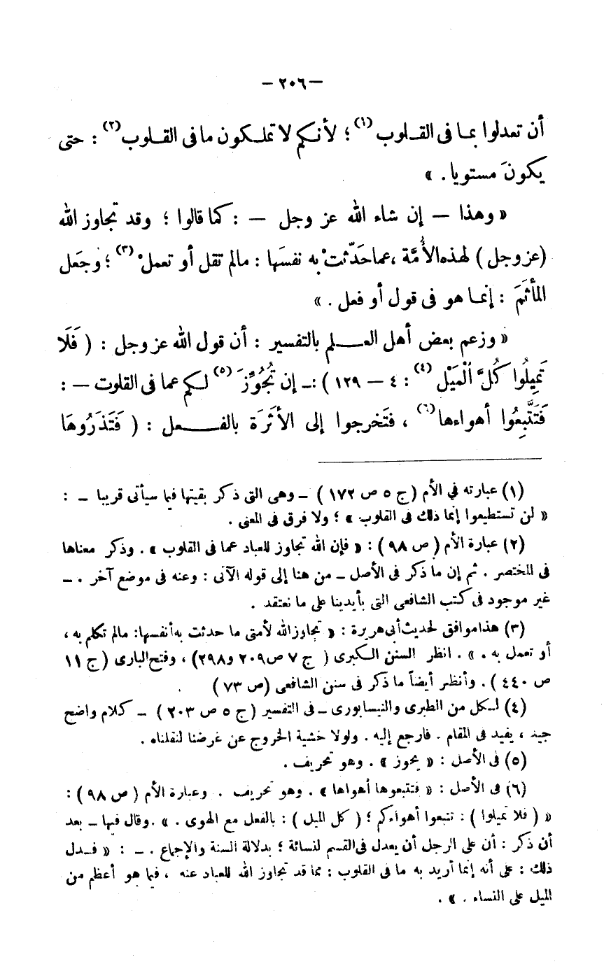 «وَزَعَمَ بَعْضُ أَهْلِ الْعِلْمِ بِالتَّفْسِيرِ: أَنَّ قَوْلَ اللَّهِ عَزَّ وَجَلَّ: (فَلا تَمِيلُوا كُلَّ الْمَيْلِ «4» : 4- 129) :- إنْ تُجُوِّزَ «5» لَكُمْ عَمَّا فى القلوت-:
