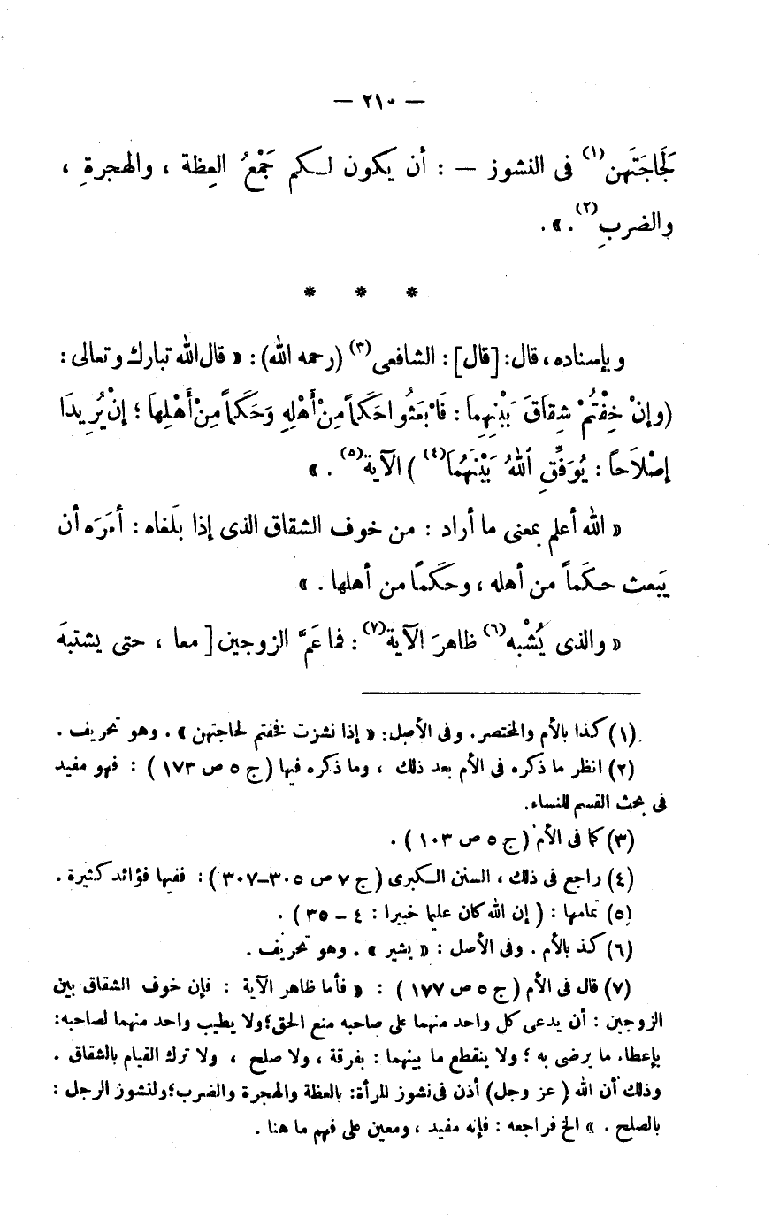 (7) قَالَ فى الْأُم (ج 5 ص 177) : «فَأَما ظَاهر الْآيَة: فَإِن خوف الشقاق بَين الزَّوْجَيْنِ: أَن يدعى كل وَاحِد مِنْهُمَا على صَاحبه منع الْحق وَلَا يطيب وَاحِد مِنْهُمَا لصَاحبه: