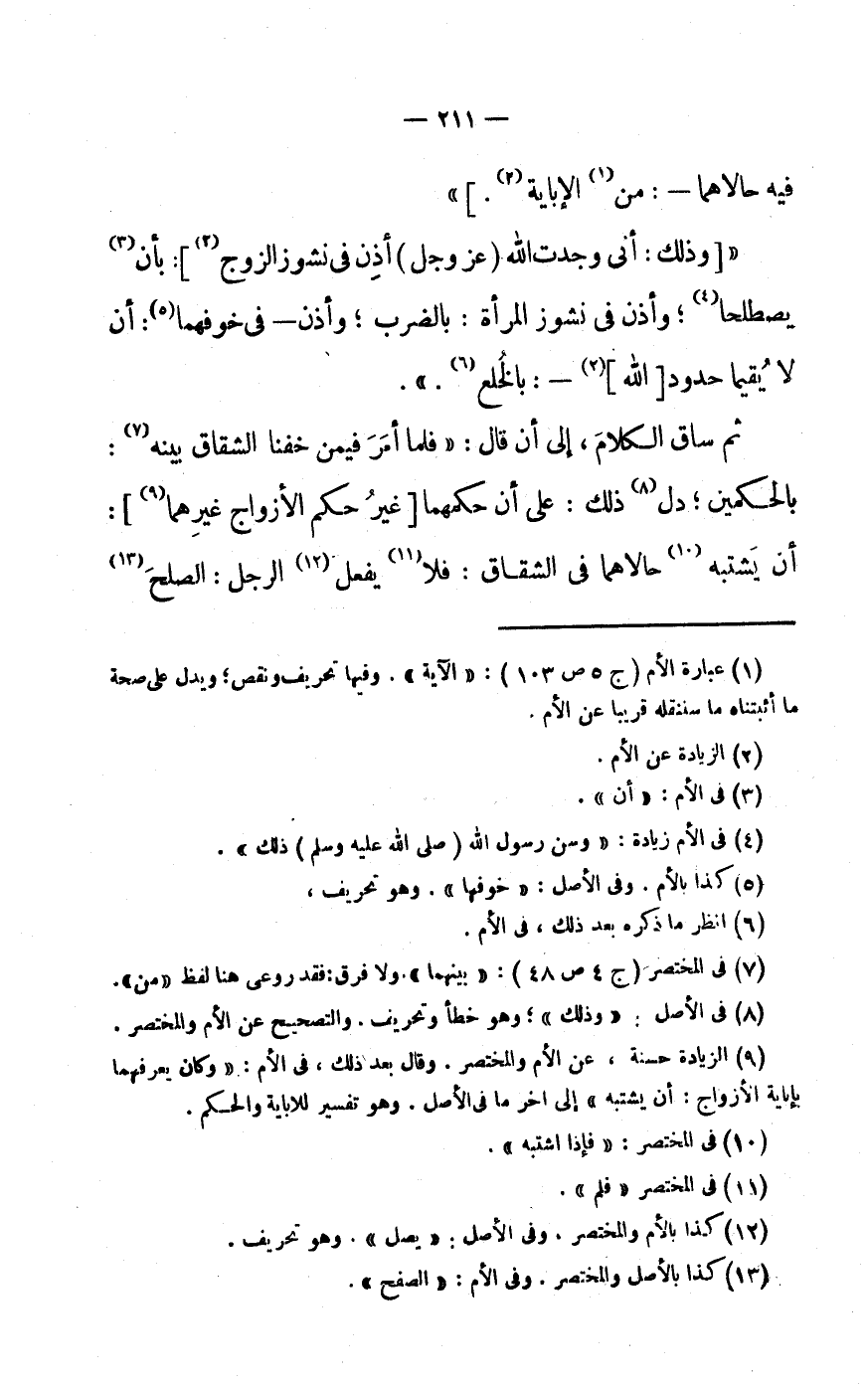 « [وَذَلِكَ: أَنِّي وَجَدْتُ اللَّهَ (عَزَّ وَجَلَّ) أَذِنَ فِي نُشُوزِ الزَّوْجِ «3» ] : بِأَنْ «4» يَصْطَلِحَا «5» وَأَذِنَ فِي نُشُوزِ الْمَرْأَةِ: بِالضَّرْبِ وَأَذِنَ- فِي خَوْفِهِمَا «6» : أَنْ لَا يُقِيمَا حُدُودَ [اللَّهِ] «7» -: بِالْخُلْعِ «8» .» .