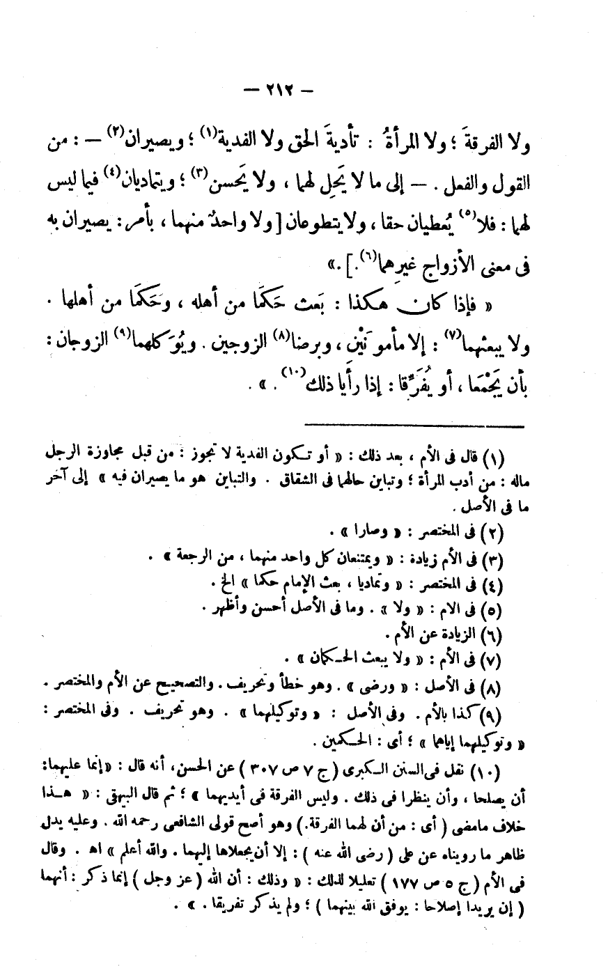 أَن يصلحا، وَأَن ينظرا فى ذَلِك. وَلَيْسَ الْفرْقَة فى أَيْدِيهِمَا» ثمَّ قَالَ الْبَيْهَقِيّ: «هَذَا خلاف مَا مضى (أَي: من أَن لَهما الْفرْقَة.) وَهُوَ أصح قولى الشَّافِعِي رَحمَه الله. وَعَلِيهِ يدل ظَاهر مَا روينَاهُ عَن على (رضى الله عَنهُ) : إِلَّا أَن يجعلاها إِلَيْهِمَا. وَالله أعلم» اهـ. وَقَالَ فى الْأُم (ج 5 ص 177) تعليلا لذَلِك: «وَذَلِكَ: أَن الله (عز وَجل) إِنَّمَا ذكر: أَنَّهُمَا (إِن يريدا إصلاحا: يوفق الله بَينهمَا) وَلم يذكر تفريقا.» .