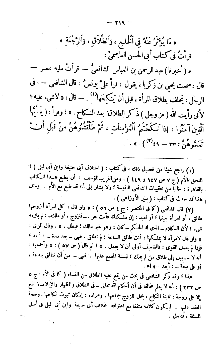 « (أَخْبَرَنَا) عَبْدُ الرَّحْمَنِ بْنُ الْعَبَّاسِ الشَّافِعِيُّ- قَرَأْتُ عَلَيْهِ بِمِصْرَ- قَالَ: سَمِعْت يَحْيَى بْنَ زَكَرِيَّا، يَقُولُ: قَرَأَ عَلَيَّ يُونُسُ: قَالَ الشَّافِعِيُّ-: فِي الرَّجُلِ: يَحْلِفُ بِطَلَاقِ الْمَرْأَةِ، قَبْلَ أَنْ يَنْكِحَهَا «1» .- قَالَ: «لَا شَيْءَ عَلَيْهِ لِأَنِّي رَأَيْتُ اللَّهَ (عَزَّ وَجَلَّ) ذَكَر الطَّلَاقَ بَعْدَ النِّكَاحِ.» وَقَرَأَ: (يَا أَيُّهَا الَّذِينَ آمَنُوا: إِذا نَكَحْتُمُ الْمُؤْمِناتِ، ثُمَّ طَلَّقْتُمُوهُنَّ مِنْ قَبْلِ أَنْ تَمَسُّوهُنَّ: 33- 49 «2» ) .» .