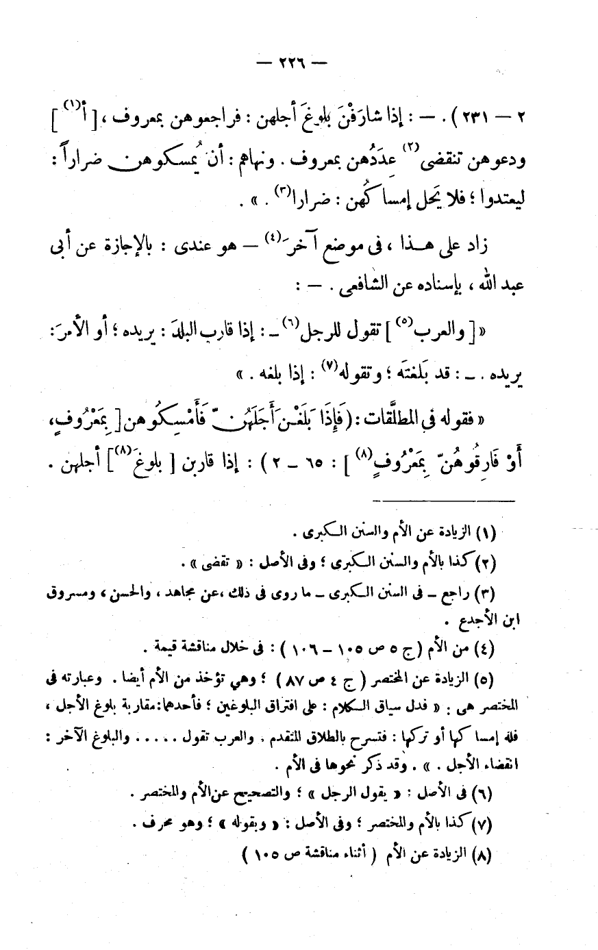 (5) الزِّيَادَة عَن الْمُخْتَصر (ج 4 ص 87) وَهِي تُؤْخَذ من الْأُم أَيْضا. وَعبارَته فى الْمُخْتَصر هى: «فَدلَّ سِيَاق الْكَلَام: على افْتِرَاق البلوغين فأحدهما: مقاربة بُلُوغ الْأَجَل، فَلهُ إِِمْسَاكهَا أَو تَركهَا: فتسرح بِالطَّلَاق الْمُتَقَدّم. وَالْعرب تَقول..... وَالْبُلُوغ الآخر: