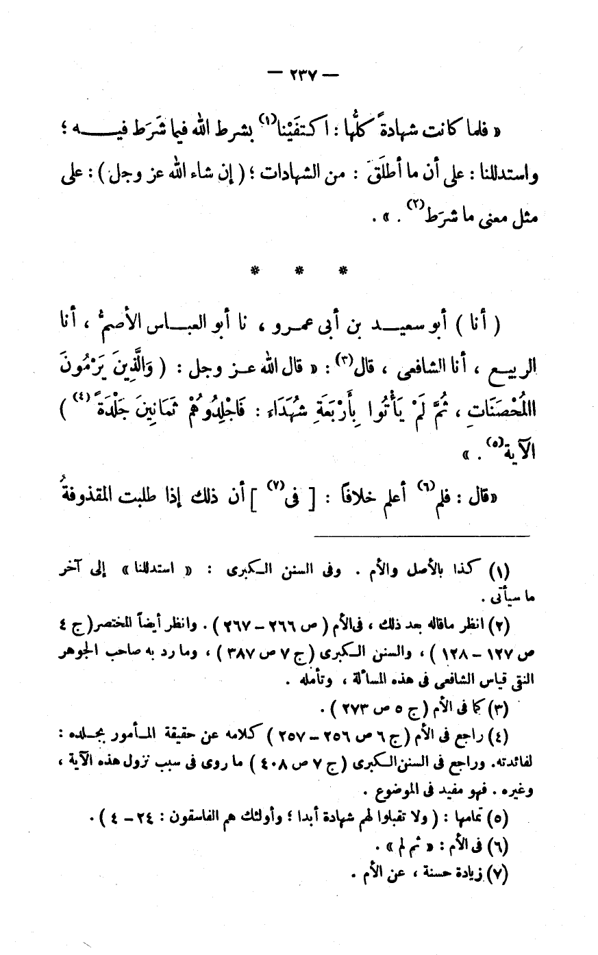 (أَنَا) أَبُو سَعِيدِ بْنُ أَبى عَمْرو، نَا أَبُو الْعَبَّاسِ الْأَصَمُّ، أَنَا الرَّبِيعُ، أَنَا الشَّافِعِيُّ، قَالَ «3» : «قَالَ اللَّهُ عَزَّ وَجَلَّ: (وَالَّذِينَ يَرْمُونَ الْمُحْصَناتِ، ثُمَّ لَمْ يَأْتُوا بِأَرْبَعَةِ شُهَداءَ: فَاجْلِدُوهُمْ ثَمانِينَ جَلْدَةً «4» ) الْآيَةُ «5» .»